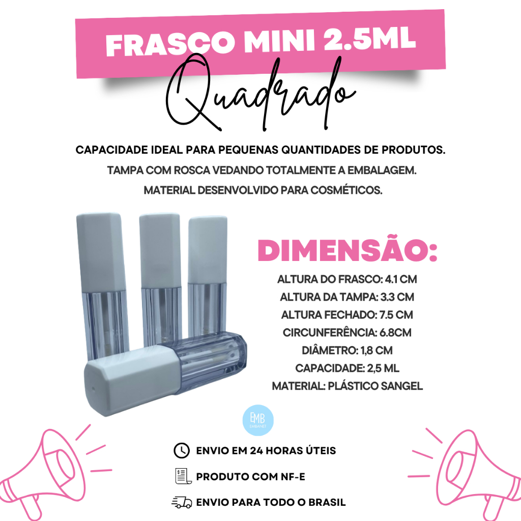 Explore a elegância e praticidade com o Mini Frasco EMBANET®. Este frasco, feito com plástico resistente e próprio para cosméticos, é a escolha perfeita para armazenar e aplicar seus Gloss de forma precisa. Com um aplicador de ponta fina e macia, garante uma aplicação suave nos lábios. Dimensões compactas tornam o frasco ideal para transporte na bolsa ou nécessaire. A tampa de rosca proporciona segurança, evitando aberturas acidentais e mantendo seu batom protegido. Além de batons líquidos, é versátil o suficiente para armazenar Gloss, Brilho Labial, Corretivo Líquido e outros. Personalize-o com adesivos, rótulos ou decorações para uma identidade única. Cada conjunto inclui 10 unidades do frasco, 10 tampas e 10 batoques. Altura do frasco: 4.1 CM Altura da tampa: 3.3 cm Altura fechado: 7.5 cm Circunferência: 6.8 cm Diâmetro: 1,8 cm Capacidade: 2,5 ml Material: Plástico Sangel Na EMBANET®, comprometemo-nos a oferecer produtos de alto desempenho, durabilidade e acabamento excepcional, garantindo uma ótima relação custo-benefício. Realizamos envios rápidos e seguros para que receba seus produtos impecáveis. Descubra a qualidade, satisfação e variedade em embalagens ao explorar mais anúncios do vendedor. Transforme sua experiência cosmética com a EMBANET®!