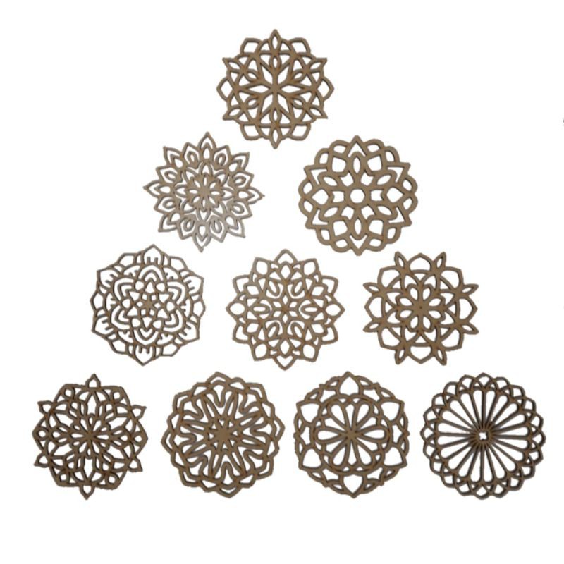 10 mini mandalas porta copos em MDF sem pintura Kit com 10 unidades sendo 1 de cada modelo como na foto! Corte a laser Diâmetro 8.5 cm MDF 3mm espessura