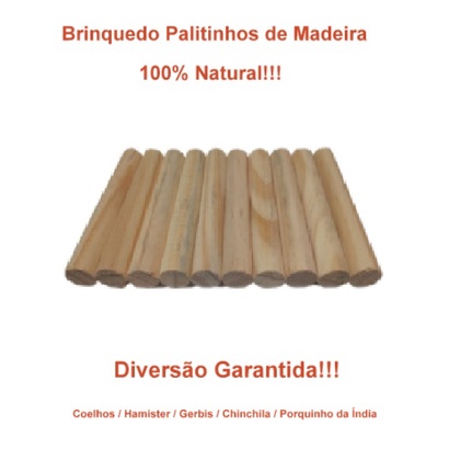 1 - Pacote com 10 Palitos de Madeira para roedores em geral. Recomendado para Porquinho da Índia, Chinchila, Hamster, Gerbil, Coelho, Twister entre outros. Produzido com madeira de pinus, certificada, sem adição de produtos tóxicos, presenvando a saude e bem estar do seu Pet. O ato de roer é a maneira natural de manter os dentes sempre aparados e higiênicos, evitando doenças e acidentes. É diversão com muita saúde para seu amiguinho. Kit com 10 unidades, de 10cm de comprimento e 15mm diâmetro.