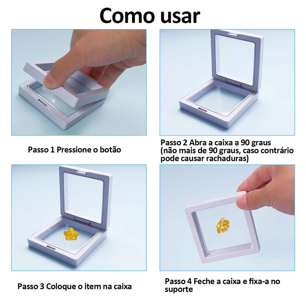 Lista de produtos: 10 Peças de molduras flutuantes 3D Cor: Branco/Preto Tamanho: 7 x 7 cm / 9 x 9 cm Material: Plástico ABS e filme PE Material de qualidade: Fabricadas em plástico ABS e película PE, estas molduras flutuantes são concebidas para durar. Proporcionam uma visão transparente, permitindo uma exibição clara e bonita dos seus itens Fáceis de usar: Basta pressionar o botão para abrir, colocar o seu item entre as películas e fixá-lo para uma exibição clara e firme e usar um secador de cabelo (não incluído) para alisar a película quando terminar Design moderno: Estas molduras flutuantes apresentam um design elegante e moderno, adicionando um apelo à maioria das exibições, quer as utilize em casa, numa loja ou numa exposição, irão realçar o apelo visual da sua coleção; as pessoas também podem utilizá-las para guardar uma variedade de itens, tais como moedas, anéis, medalhas e outros tesouros Exposição multifuncional: perfeitas para organizar e proteger seus itens colecionáveis, essas molduras flutuantes mantêm os itens protegidos contra poeira e arranhões, ao mesmo tempo que permitem fácil acesso e exibição.