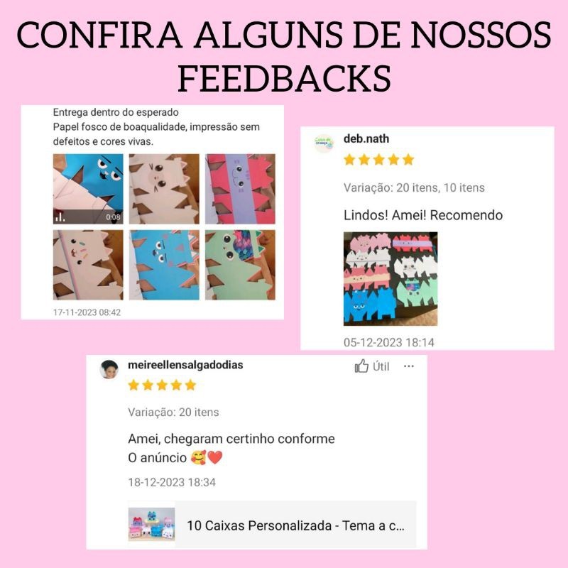 kit com 10 caixas Todas elas são enviadas cortadas e vincadas, de fácil montagem pela mamãe ( necessário apenas cola, qualquer tipo de cola) Não acompanha Laços Nossas caixas são confeccionadas em papel 180g Personalizamos com nome e idade , nos enviar no chat no ato da compra, o não envio da personalização será enviado sem. Estamos à disposição caso tenha alguma dúvida.