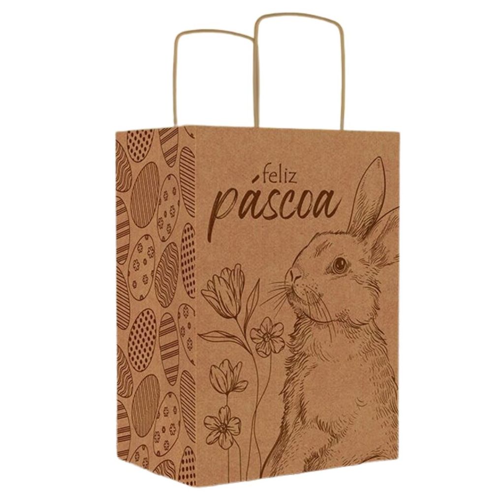 A Sacola Eco PP da linha Páscoa Encantos é prática e sustentável. Feita em papel kraft resistente, traz um visual natural e elegante, ideal para lembranças e presentes menores. Medidas cm (CxLxA) 18x12x25 Material Papel Kraft e Tinta Sugestões de uso Ideal para mini kits, sabonetes artesanais, velas decorativas ou bombons. Diferenciais Alça trançada; Design moderno e funcional.