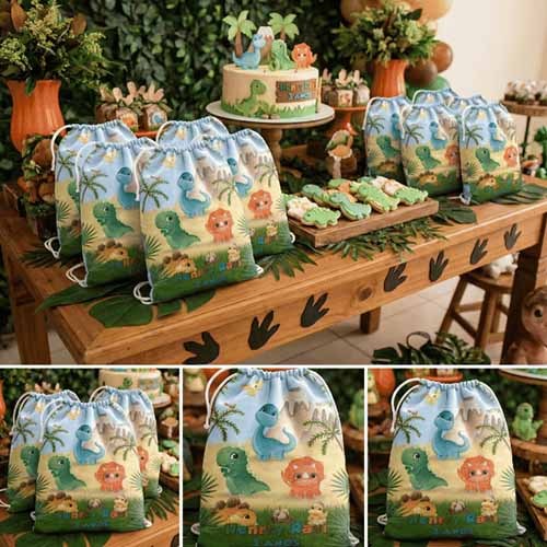 10 Sacolinhas Personalizadas de tecido festa de aniversário Dino Baby
