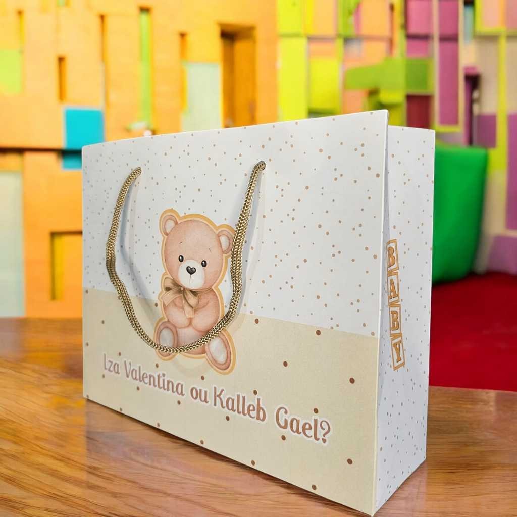 10 Sacolinhas Personalizadas (G) Festa Chá de Bebê Ursinho Bege Neutro (20x16x6cm)