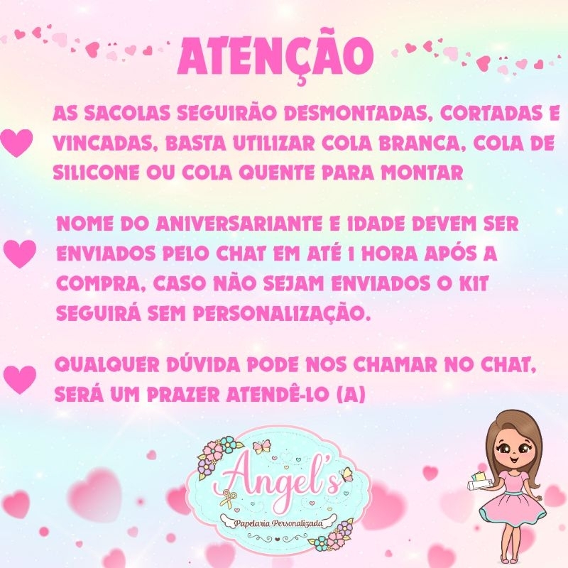 ATENÇÃO!!! ENVIE PELO CHAT O TEMA, NOME DA CRIANÇA E IDADE EM ATÉ 2 HORAS APÓS A COMPRA, CASO NÃO SEJA ENVIADO O PRODUTO SEGUIRÁ NO TEMA DO ANÚNCIO SEM PERSONALIZAÇÃO. FAZEMOS TODOS OS TEMAS, ENVIE O TEMA DESEJADO QUE IREMOS MONTAR A ARTE E ENVIAR PARA APROVAÇÃO, O PRAZO DE APROVAÇÃO É DE 24 HORAS, CASO NÃO HAJA RETORNO ENVIAREMOS A ARTE PROPOSTA. O PRAZO DE PRODUÇÃO E ENVIO DO PRODUTO É DE ATÉ 5 DIAS ÚTEIS APÓS A COMPRA. 📏 Tamanho: 20cm largura 16cm altura 6,5cm profundidade 📦 Especificações: Produzidas em papel off set fosco 180g Acompanha fio de nylon para as alças ✂️ Produto pegue e monte As sacolas vão cortadas e vincadas, para colagem da lateral e do fundo pelo cliente (muito fácil de colar) Enviamos o Qr code com vídeo de montagem das sacolas