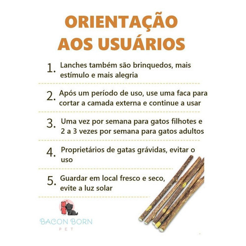 Caros Clientes, por favor, leiam com atenção o anúncio. Isso ajudará a ter certeza do que está comprando. Contém: || 10 (DEZ) unidades Varetas/Palito Matatabi - (02 pacotes com 5 unidades cada) Você provavelmente já ouviu falar em erva de gato ou catnip, conhecida por deixar os felinos felizes e relaxados. Mas você conhece o Matatabi (ou silver vine)? É uma planta parecida com a erva de gato, mas que propõe efeitos mais potentes. Outra alternativa para deixar seu bichano alegre. Os palitos Matatabi, são muitos usados na Ásia para cuidar dos dentes dos gatinhos. Veja outros benefícios dos palitos: || Contém Actinidina que provoca um estado de euforia e relaxamento. || Didroactinidiolide que tem um aroma leve e doce e atua como estimulante natural. || Reduz em 97,8% a placa dentária do gato. || Apura as habilidades de caça. || Aumenta a ligação do gato com o ser humano. || Ajuda a expelir bola de pelos. || Alivia o stress. De acordo com o estudo do Dr. Mark Mitchell, da Universidade de Illinois, os gatos brincaram duas vezes e meia a mais, com brinquedos associados com Matatabi, do que gatos com brinquedos sem ele. Devido aos seus componentes químicos naturais, e ao fato dos gatos o mastigarem, contribui também, para a redução da placa dentária. Para retomar seu efeito, depois de um tempo de uso, basta retirar a camada exterior, utilizando uma faca. Obrigada por visitar nossa loja!! Qualquer dúvida é só mandar uma mensagem!