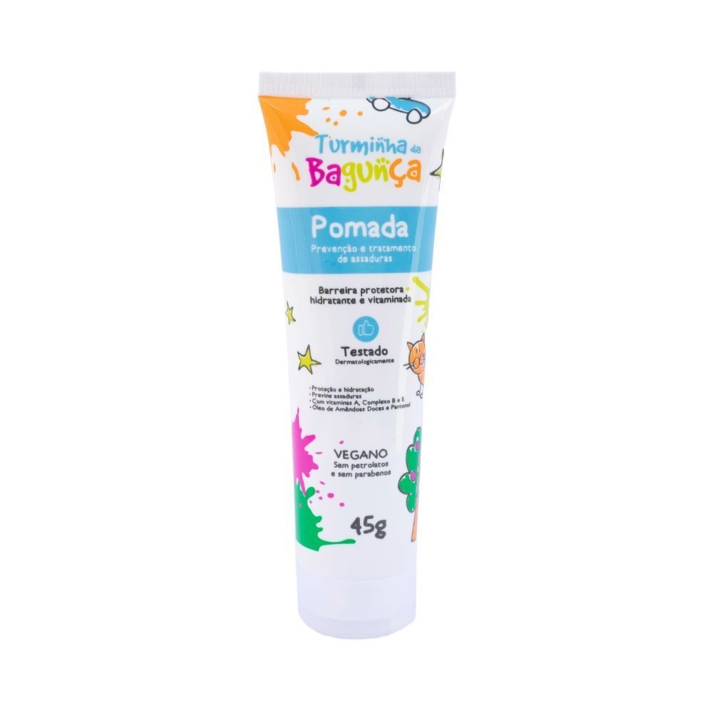 10 UNIDADES - Pomada Prevenção e Tratamento de Assaduras Turminha da Bagunça - Prevenção e tratamento de assaduras - Proteção e hidratação - Com vitaminas A, complexo B e E. - Óleo de Amendoas Doce e Pantenol. - Vegano. - Sem Petrolatos - Sem Parabenos. - Testado Dermatologicamente A Pomada Infantil possui uma formulação suave e segura, rica em vitaminas A, do complexo B e E, Pantenol e óleo de Amêndoas Doces, que fornecem emoliência e hidratação. Seus ativos fornecem uma barreira protetora contra substâncias presentes na urina e fezes que cusam assaduras. Modo de Usar: Limpe cuidadosamente a pele do bebê e aplique uma camada de pomada sobre a área a proteger, massageando suavemente.