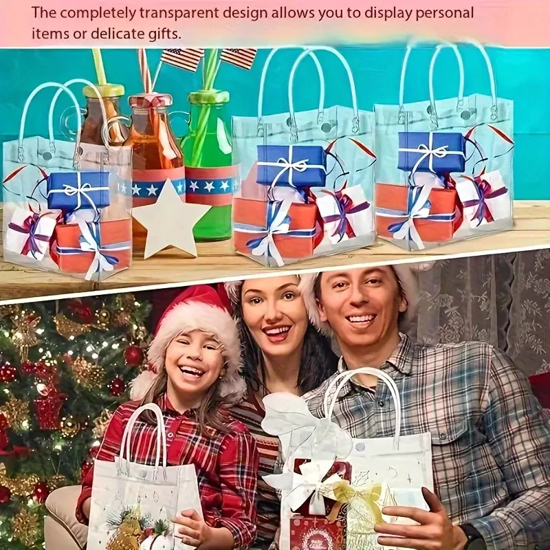 Pronta Entrega lista de embalagem:10 * sacos de presente transparentes Características: 1.Material plástico de PVC: A sacola de compras transparente com alça é feita de plástico PVC, que é segura e confiável, impermeável, reutilizável, de superfície lisa, confortável de segurar e tocar, fácil de limpar e proporciona uma experiência agradável ao usuário. 2.Alça e fecho de pressão: cada sacola de presente é equipada com alça resistente e fecho de pressão, facilitando o transporte e evitando a perda de itens. 3.Fundo tridimensional: O fundo da sacola de presente de plástico de PVC transparente se expande para um estado tridimensional, expandindo o volume da sacola de presente. 4. Bolsas de lembrancinhas: ótimas para presentes ou lembrancinhas, tornando-as fáceis de guardar e transportar sem ocupar muito espaço. 5.Ampla aplicação: perfeita para compras, festas, casamentos, chás de bebê, celebrações, festivais, chás de panela, Natal, suprimentos de moda, artesanato, etc. Sacos de PVC transparente são ótimos para presentear, usar pessoalmente e transportar itens de trabalho. Especificação: Material: PVC Dimensões: aproximadamente 20x20x8cm Aviso: 1. Devido às diferenças nos monitores e nos efeitos de iluminação, a cor real do item pode ser ligeiramente diferente da cor mostrada na imagem. Obrigado! 2. Devido à medição manual, pode haver um desvio de medição de 1 a 3 cm.