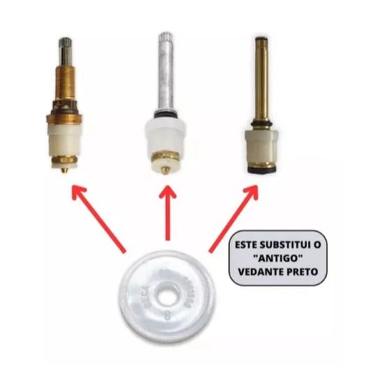 Vedante Para Torneira antiga e Registro de Pressão Deca MVS - Ref.: 4152.010 KIT CONTEM: 10 UNIDADES DE VEDANTES. Vedante para Reparos MVS Mecanismo de Vedação Substituível (Deca) Vedante é encaixado na parte de baixo do Registro Deca (Registro de Chuveiro Ou Torneira) Compatível com os MVS: 4688002 – 4688004 – 4688024 – 4688026 – 4688029 – 4688048 – 4688064 – 4688100 – 4688104 – 4688124 – 4688155 – 4688184 – 4688204 COMPATÍVEL COM TODOS OS REPAROS ORIGINAIS DECA (mecanismo de aperto para vedação da água) PARA QUE SERVE? Este vedante serve para acabar com o “pinga pinga” do Chuveiro ou Torneira da marca Deca. Caso seu Chuveiro ou Torneira Deca esteja apresentando vazamentos após o fechamento do registro, é necessário trocar este vedante.