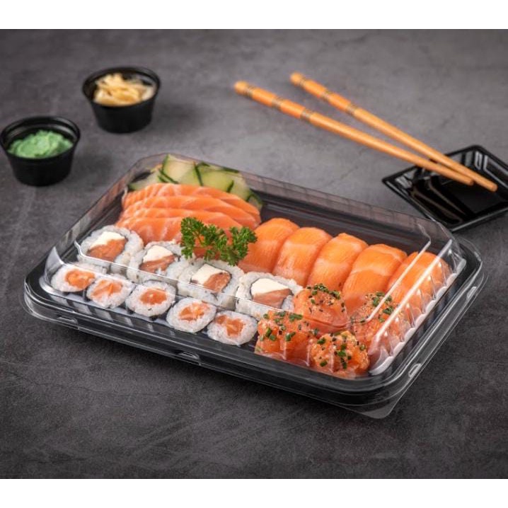 EMBALAGEM PLÁSTICA COM TAMPA- COMBINADO 03 100 ou 200 unidades. Escolher no momento da compra, no campo de variação. Características: Marca: JF PACK Dimensões Internas: 225X145X50mm Dimensões Externas: 260X175X60mm Material: PET Cor Base: Preta Cor Tampa: Cristal
