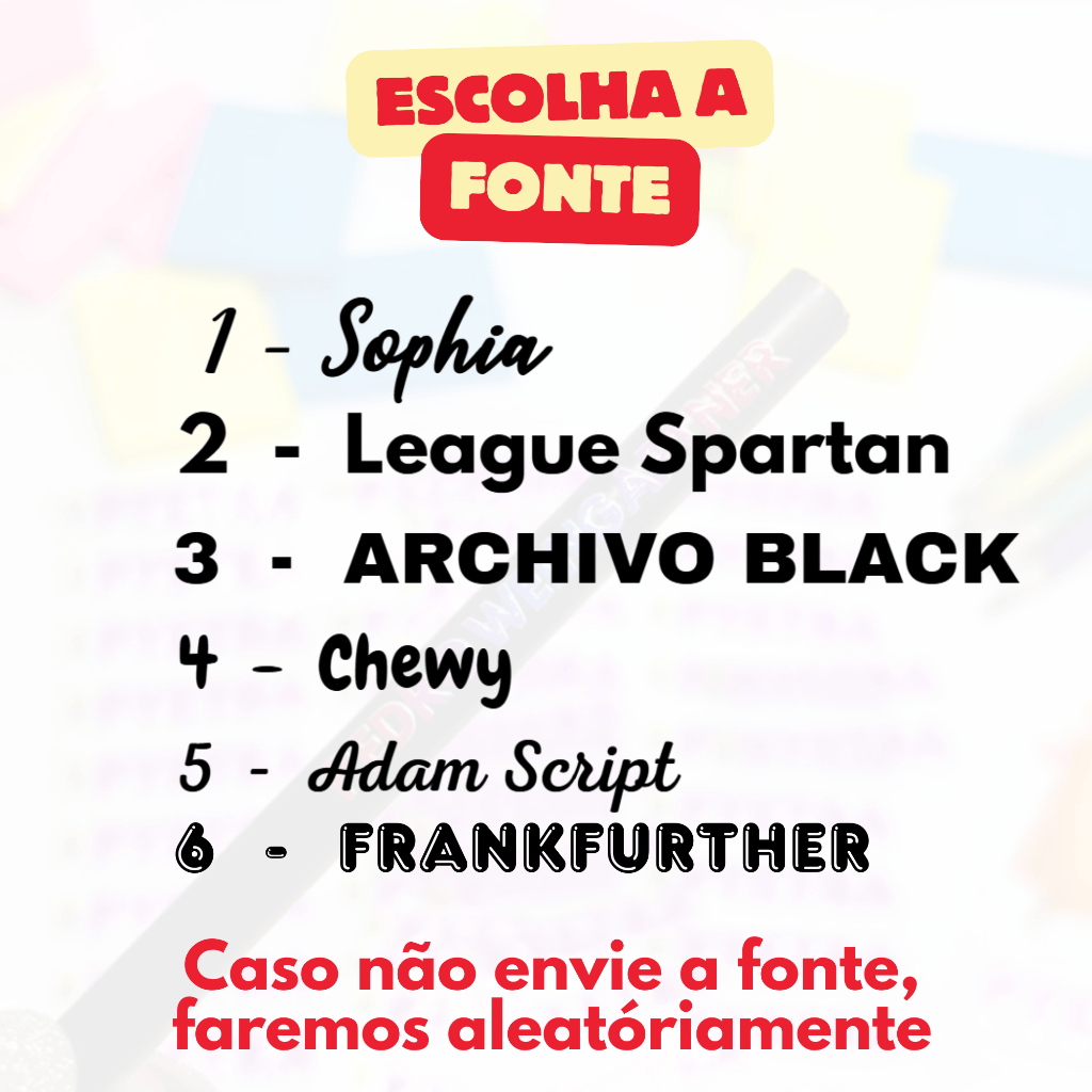 100 unidades Adesivo DTF UV personalizado para identificação de lápis escolares, ideal para uso em escola, creche e atividades do dia a dia. 📏 Tamanho: 5 x 1 cm ✨ Material: DTF UV – alta qualidade, resistente à água e ao uso diário 🖊️ Aplicação: Fácil, não precisa de calor 🎨 Personalização: Nome da criança 🌈 Cor da fonte: Escolhida pelo cliente nas variações do produto 📌 Como funciona a personalização 1️⃣ Escolha a cor da fonte nas opções do anúncio 2️⃣ Informe o nome da criança: No campo de observações do pedido ou Pelo chat da Shopee após a compra ⚠️ Pedidos sem o nome informado podem ter o envio atrasado. ‼️ 1 nome por pedido! Temos outro kit com menor quantidade e personagens com nome! 🧼 Modo de aplicação (importante) Antes de aplicar o adesivo, limpe o lápis com álcool para remover poeira, óleo ou resíduos. Aguarde secar completamente, aplique o adesivo e pressione bem para melhor fixação. ℹ️ Informações importantes Produto personalizado, não realizamos trocas ou devoluções Aplicar somente em superfície limpa, seca e lisa As cores podem variar levemente conforme a tela ⚠️ Atenção: Antes da aplicação definitiva, faça um teste de aderência. Em determinados materiais, a cola do DTF pode reagir com a superfície, podendo remover tinta ou acabamento. Não nos responsabilizamos por aplicações sem teste prévio.