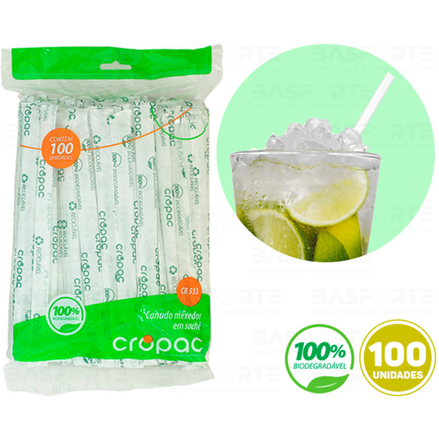 100 Canudinho Canudo Colher Mexedor Biodegradável Para Drinks Caipirinha Sucos Pacote Cropac