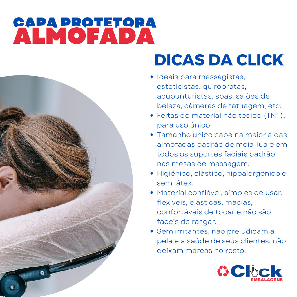 💆 Capa Protetora Descartável para Encosto de Cabeça - Pacote com 100 Unidades Garanta o máximo de higiene e profissionalismo em seus atendimentos com as capas protetoras em TNT. Desenvolvidas com design em formato de "U" e acabamento elástico, elas oferecem uma barreira de proteção essencial para o suporte facial de macas e cadeiras de massagem. ✅ Diferenciais para o seu Atendimento: Biossegurança e Higiene: Material 100% polipropileno (TNT), atóxico e hipoalergênico. Protege seu equipamento e passa confiança ao cliente. Ajuste Universal com Elástico: O elástico de poliéster permite que a capa envolva totalmente o encosto (padrão meia-lua), evitando que ela saia do lugar durante o procedimento. Toque Macio (Soft Touch): Material flexível e confortável que não irrita a pele e não deixa marcas de pressão no rosto. Praticidade Profissional: Uso único e descartável, facilitando a troca rápida entre um cliente e outro. 📋 Ideal para: Estética, Salões de Beleza e Spas. Clínicas de Fisioterapia, Quiropraxia e Acupuntura. Estúdios de Tatuagem e Massoterapeutas. 📋 Ficha Técnica: Composição: Não tecido 100% Polipropileno (TNT). Acabamento: Elástico de Poliéster. Tamanho: 53cm x 53cm (Ajuste universal). Cor: Branca. Quantidade: Pacote com 100 unidades. Confira toda linha no nosso site! 🏆 Conheça a CLICK EMBALAGENS Distribuidora de confiança desde 2009 com mais de 20.000 itens. Preço de Atacado: O melhor custo-benefício para o seu negócio. Atendimento Especializado: Equipe treinada para te ajudar na melhor escolha. Loja Física em SP: Visite-nos e conheça nossos produtos pessoalmente!