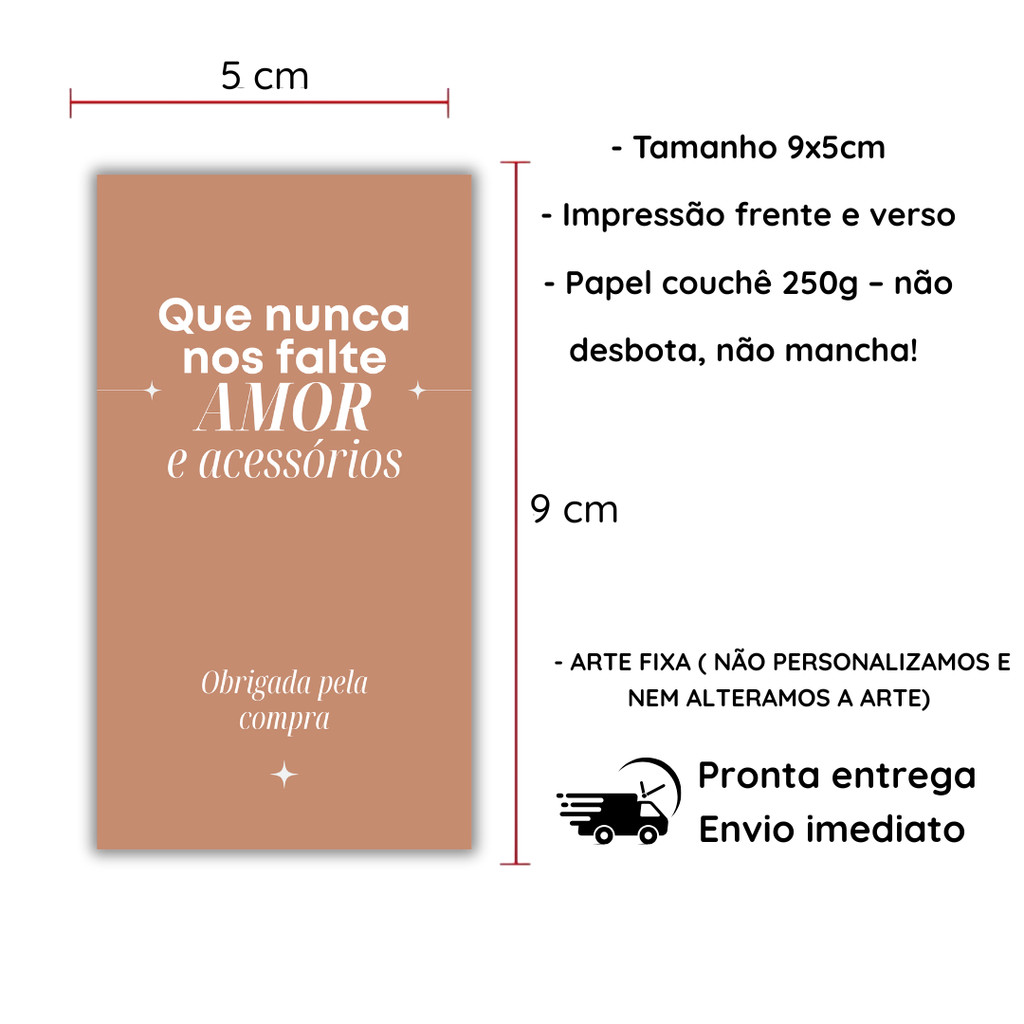 Cartão de Agradecimento 9x5cm – Pronta Entrega Surpreenda suas clientes com um toque de carinho nas suas embalagens! Ideal para quem quer encantar no unboxing e fortalecer a marca com profissionalismo e delicadeza. Destaques do Produto: - Tamanho 9x5cm - Impressão Frente e Verso - Papel couchê 250g – não desbota, não mancha - Impressão digital de alta resolução - Pronta entrega | Envio imediato | Arte fixa Perfeito para empreendedoras que cuidam de cada detalhe. Combine com tags, adesivos e outros mimos na nossa loja e economize no frete! Garantias e Avisos: - Pode haver variação de 10% a 15% nas cores, conforme o brilho e contraste do monitor/celular. Isso não caracteriza defeito. - Materiais e acabamentos diferentes podem apresentar variações entre si. - Todos os produtos passam por checagem de qualidade antes do envio. - Caso seu pedido chegue com algum problema ou avaria no transporte, entre em contato conosco com fotos pelo chat para avaliarmos e resolver o mais rápido possível.