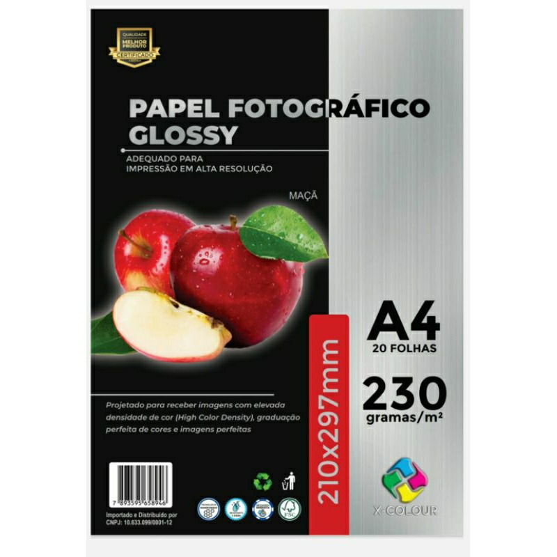 Descrição Papel Fotográfico A4 Glossy Brilhante 230gr - Caixa com 100 unidades a prova de água Papel Fotográfico Brilhante A4 para impressoras jato de tinta. • Alto Brilho, secagem instantânea. • 230 gr/m2. Resistente a água, para impressões duráveis. • Resistência a impressão digital. Não fica marca de dedo na impressão. É um papel fotográfico de alto brilho, branco, que utiliza a nova tecnologia Resin Coated, para uso em impressoras inkjet. Esta nova tecnologia utiliza revestimento cerâmico constituído de microscópios poros que se fecham ao receber a micro-gota de tinta que a impressora joga no papel ao imprimir. Uma vez que a tinta entra nesses poros, os mesmos fecham, protegendo assim a tinta e conseqüentemente a impressão, isso explica o fato do papel ser resistente a água, e ao se fecharem os poros proporcionam secagem instantânea, permitindo impressões de fotografias e imagens em alta resolução. Este papel foi projetado para fornecer imagens com elevada densidade de cor (high color density), graduação perfeita de cores (optimal color gradation) e imagens perfeitas (perfect image sharpness). Ideal para ser utilizado em impressões de imagens e fotografias digitais. PRINCIPAIS VANTAGENS • Qualidade profissional para impressões foto-realísticas. • Superfície altamente resistente a água. • Tecnologia Resin Coated. • Secagem instantânea, não borra. • Cores vivas e brilhantes. • Compatível com qualquer impressoras jato de tinta. • Impressões a prova de manchas e borrões. • Extrema alta resolução, até 5760 dpi com alta definição de detalhes. • Perfeito para tintas corantes. • Ideal para impressão de fotos de câmeras digitais. PROPRIEDADES FÍSICAS • Gramatura: 230 gr/m2 • Espessura: 265 µm • Brilho: 92,00 % (TAPPI T452 om-87) • Opacidade: 96,5 % • Tipo do Papel: Acid free archival paper Características: - Impressões em alta resolução com cores vivas, brilho e de qualidade; - Para uso em impressoras a jato de tinta com tinta corante; - Alta capacidade de absorção de tinta; - Secagem instantânea, super brilho e definição de imagem; - Papel a prova D` Água mesmo com uso de tintas corantes; - Papel com Brilho para impressora Jato de Tinta; - Papel Foto com secagem instantânea e à prova d´agua; - Serve para imprimir fotos, capas de CDs, DVD e BLU RAY. - Gramatura: 230gr; - Tamanho: A4 (210mm x 297mm); - Tipo: Papel fotográfico glossy (brilhante);