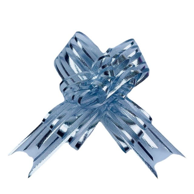 100 LAÇOS FACIL P/ PRESENTE ORGANZA HOLOGRÁFICO PRATA GRANDE 3 CM x 47 CM (Ex)