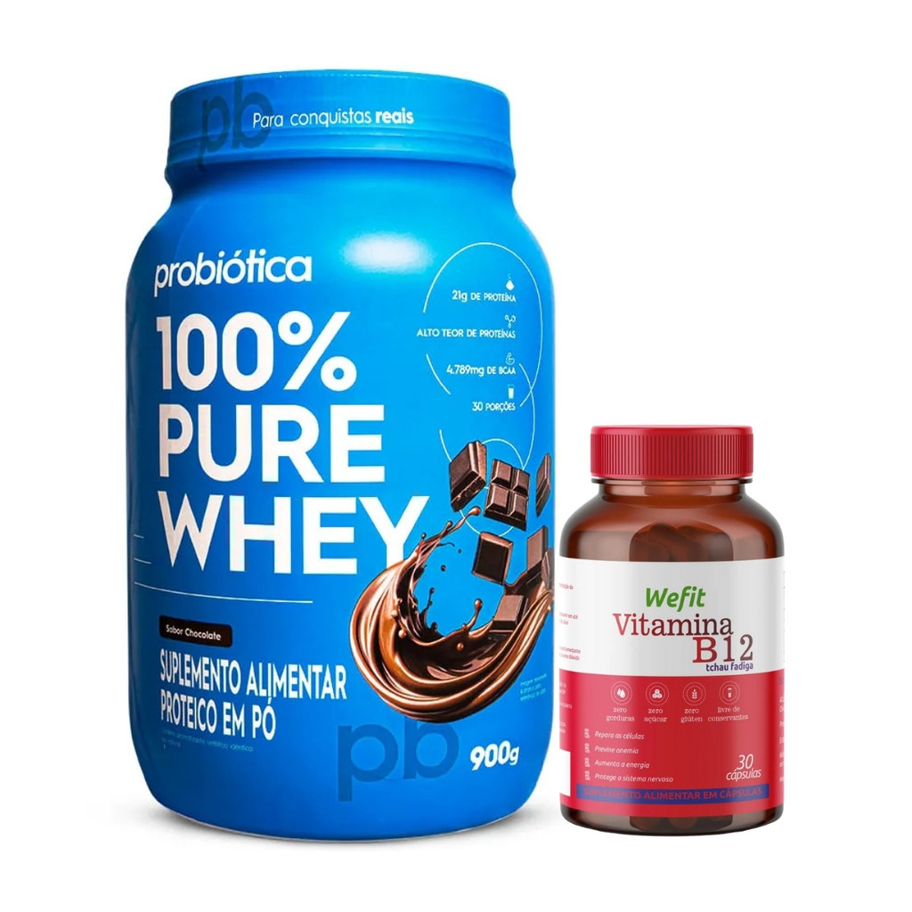 100% Pure Whey Pote 900g Probiotica + Vitamina B12 C/30 Cápsulas WeFit Sobre o produto: O combo 100% Pure Whey 900g Probiótica + Vitamina B12 30 Cápsulas WeFit é a combinação perfeita para quem busca desempenho, recuperação muscular e suporte à saúde geral. Enquanto o 100% Pure Whey fornece proteínas de alto valor biológico para recuperação e crescimento muscular, a Vitamina B12 da WeFit atua na produção de células vermelhas, energia e proteção do sistema nervoso. Juntos, oferecem suporte completo para treinos intensos e um estilo de vida mais ativo e equilibrado. Como consumir: 100% Pure Whey: Diluir 2 medidas (em média 30g) em 200ml de água ou bebida de sua preferência, uma vez ao dia, ou conforme orientação profissional. Vitamina B12: Ingerir 1 cápsula ao dia com água, preferencialmente junto a uma refeição. Benefícios: - Alta concentração de proteína para construção e manutenção muscular - Whey com excelente digestibilidade e rápida absorção - Suporte à saúde celular e neurológica com a Vitamina B12 - Combate a fadiga e auxilia no metabolismo energético - Zero glúten e com baixo teor de gorduras e açúcares - Ideal para praticantes de atividades físicas e pessoas com dietas restritivas Alergênicos: Whey Protein: Contém derivados do leite e da soja (lecitina). Vitamina B12: Pode conter traços de leite, soja, ovos e amendoim. Ambos os produtos não contêm glúten. Ingredientes: 100% Pure Whey: Proteína concentrada do soro do leite (WPC), aromatizantes, edulcorantes (sucralose e acessulfame de potássio) e emulsificante lecitina de soja. Vitamina B12: Cianocobalamina (Vit. B12), agente de massa amido e antiumectante dióxido de silício. Cápsula: gelatina e corante dióxido de titânio. Advertências: - Produto indicado para maiores de 19 anos - Este produto não é um medicamento - Não exceder a recomendação diária de consumo - Manter fora do alcance de crianças - Em caso de enfermidades ou uso de medicamentos, consulte seu médico - Gestantes, lactantes e crianças não devem consumir sem orientação médica Conclusão: O kit 100% Pure Whey Probiotica + Vitamina B12 WeFit é ideal para quem busca fortalecer os músculos, aumentar a disposição e cuidar da saúde em um só combo. Com ingredientes de qualidade e fórmulas práticas, ele se adapta à rotina de treinos e suplementação com eficácia e conveniência.