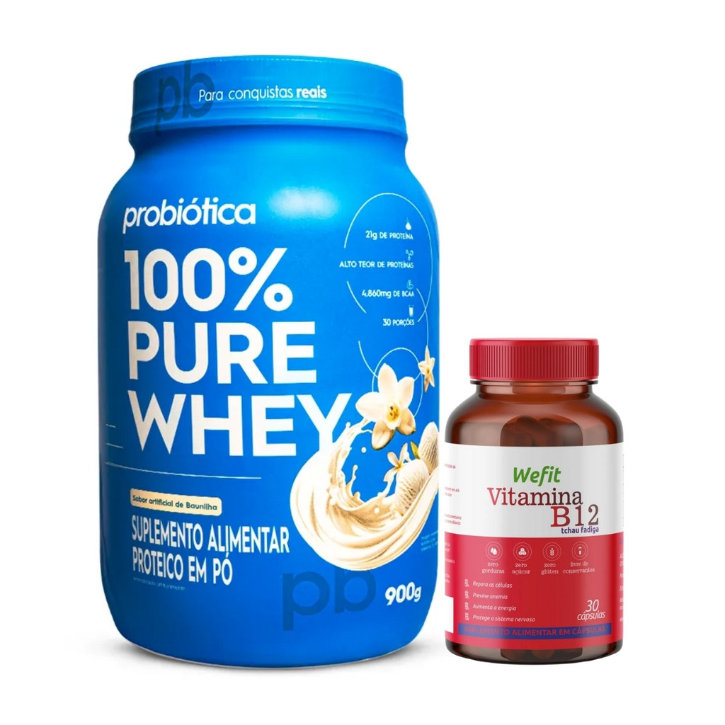 100% Pure Whey Pote 900g Probiotica + Vitamina B12 C/30 Cápsulas WeFit Sobre o produto: O combo 100% Pure Whey 900g Probiótica + Vitamina B12 30 Cápsulas WeFit é a combinação perfeita para quem busca desempenho, recuperação muscular e suporte à saúde geral. Enquanto o 100% Pure Whey fornece proteínas de alto valor biológico para recuperação e crescimento muscular, a Vitamina B12 da WeFit atua na produção de células vermelhas, energia e proteção do sistema nervoso. Juntos, oferecem suporte completo para treinos intensos e um estilo de vida mais ativo e equilibrado. Como consumir: 100% Pure Whey: Diluir 2 medidas (em média 30g) em 200ml de água ou bebida de sua preferência, uma vez ao dia, ou conforme orientação profissional. Vitamina B12: Ingerir 1 cápsula ao dia com água, preferencialmente junto a uma refeição. Benefícios: - Alta concentração de proteína para construção e manutenção muscular - Whey com excelente digestibilidade e rápida absorção - Suporte à saúde celular e neurológica com a Vitamina B12 - Combate a fadiga e auxilia no metabolismo energético - Zero glúten e com baixo teor de gorduras e açúcares - Ideal para praticantes de atividades físicas e pessoas com dietas restritivas Alergênicos: Whey Protein: Contém derivados do leite e da soja (lecitina). Vitamina B12: Pode conter traços de leite, soja, ovos e amendoim. Ambos os produtos não contêm glúten. Ingredientes: 100% Pure Whey: Proteína concentrada do soro do leite (WPC), aromatizantes, edulcorantes (sucralose e acessulfame de potássio) e emulsificante lecitina de soja. Vitamina B12: Cianocobalamina (Vit. B12), agente de massa amido e antiumectante dióxido de silício. Cápsula: gelatina e corante dióxido de titânio. Advertências: - Produto indicado para maiores de 19 anos - Este produto não é um medicamento - Não exceder a recomendação diária de consumo - Manter fora do alcance de crianças - Em caso de enfermidades ou uso de medicamentos, consulte seu médico - Gestantes, lactantes e crianças não devem consumir sem orientação médica Conclusão: O kit 100% Pure Whey Probiotica + Vitamina B12 WeFit é ideal para quem busca fortalecer os músculos, aumentar a disposição e cuidar da saúde em um só combo. Com ingredientes de qualidade e fórmulas práticas, ele se adapta à rotina de treinos e suplementação com eficácia e conveniência.