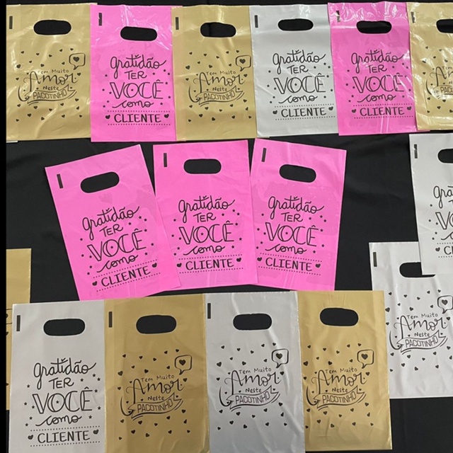 100 Sacolas Plásticas Frase 16X20 20X30 30X40 40X50 Boca de Palhaço Alça Vazada Sacola Lembrancinha