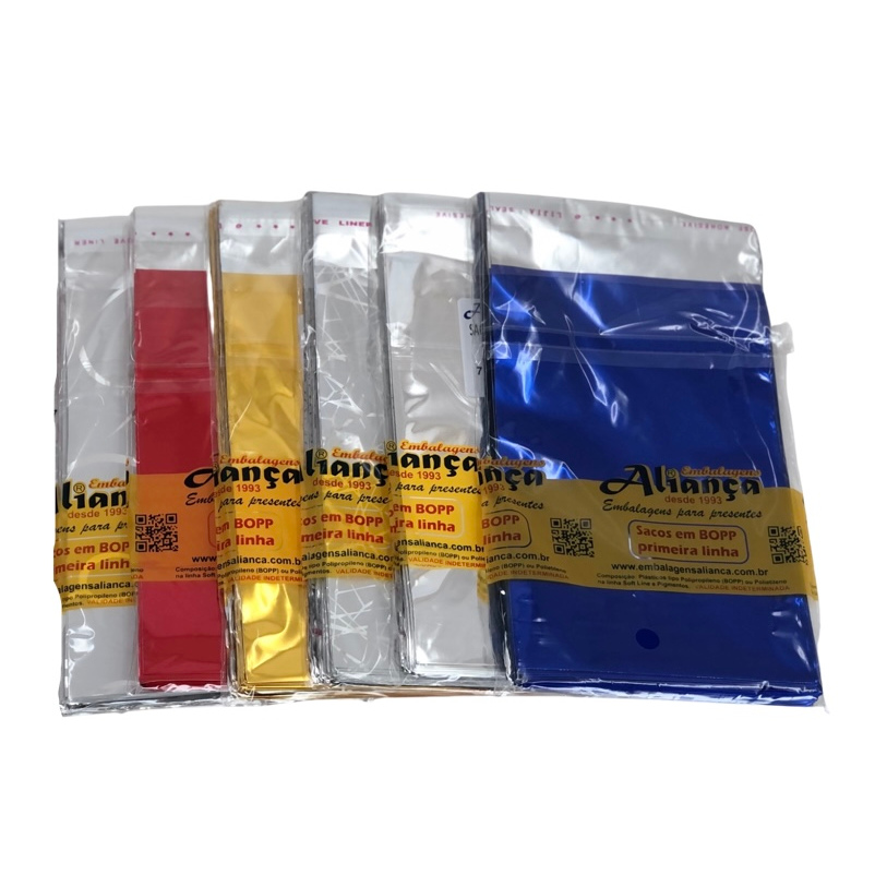 Sacos metalizados de alto brilho adesivados especial para bijouterias. Faça seu presente ficar inesquecível com essas maravilhosas embalagens. Tamanho 10x15cm + 3cm de aba com adesivo para fechar o saquinho. Cores metalizadas em material BOPP. Embalagem com 100 unidades. Não são sortidos Não fazemos personalização Marca: Embalagens Aliança