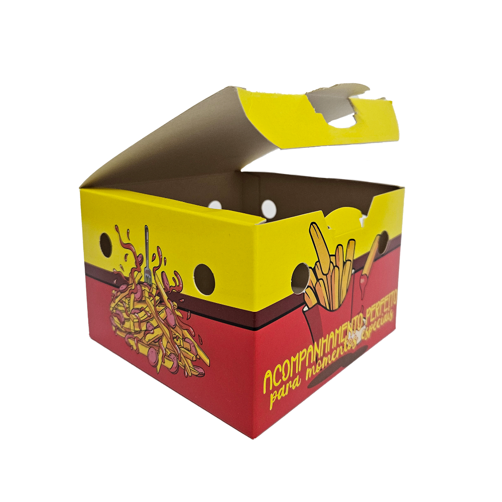 Caixa para frituras com furos para não murcha, suas batatas sempre crocantes Feito em Papel Cartão 300g Dimensões: 11,8x11,8x8cm PACOTE COM 100 UNIDADES Somos uma empresa especializada em embalagens, tudo feito com muito carinho e qualidade