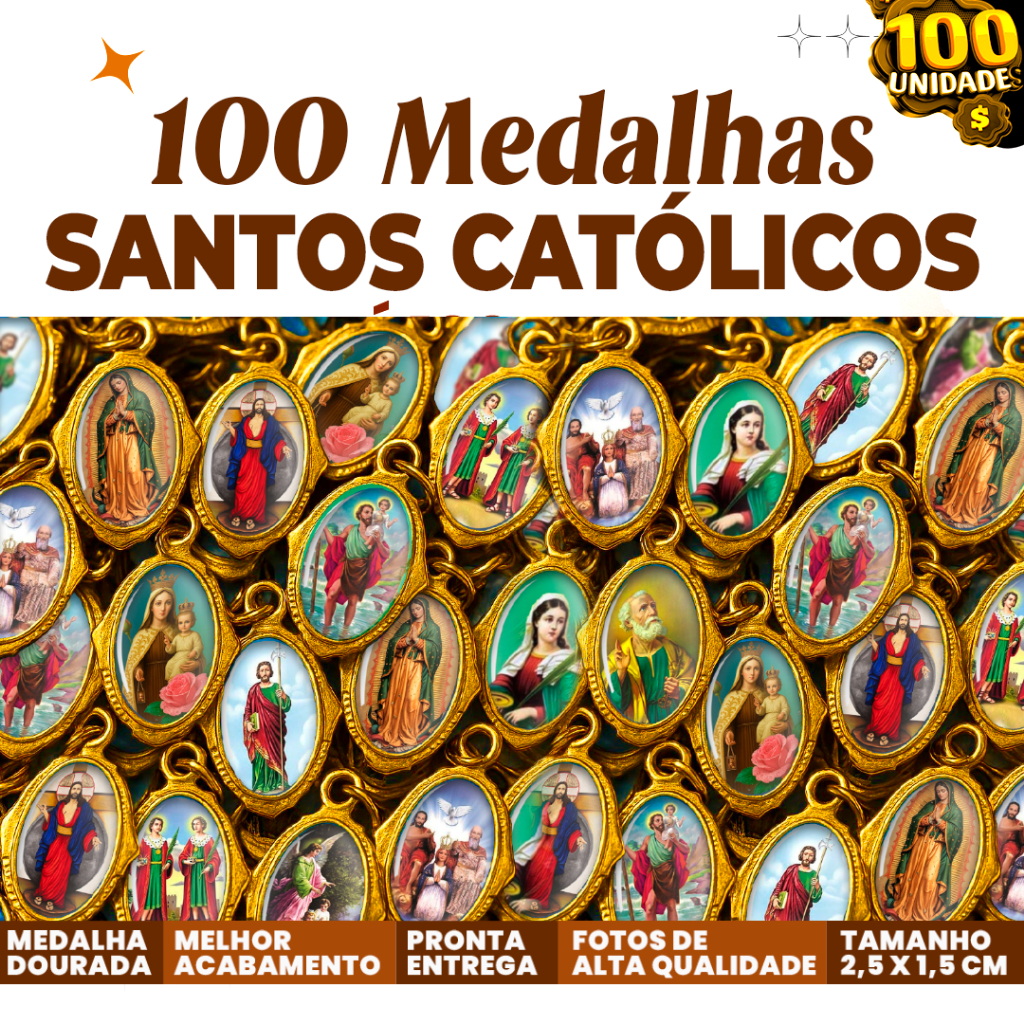 | 100 Unidades - Medalha Católica Dourada: Escolha entre Vários Santo... este produto | R$ 48,90 | 18% | 4.9/5 | 30 |