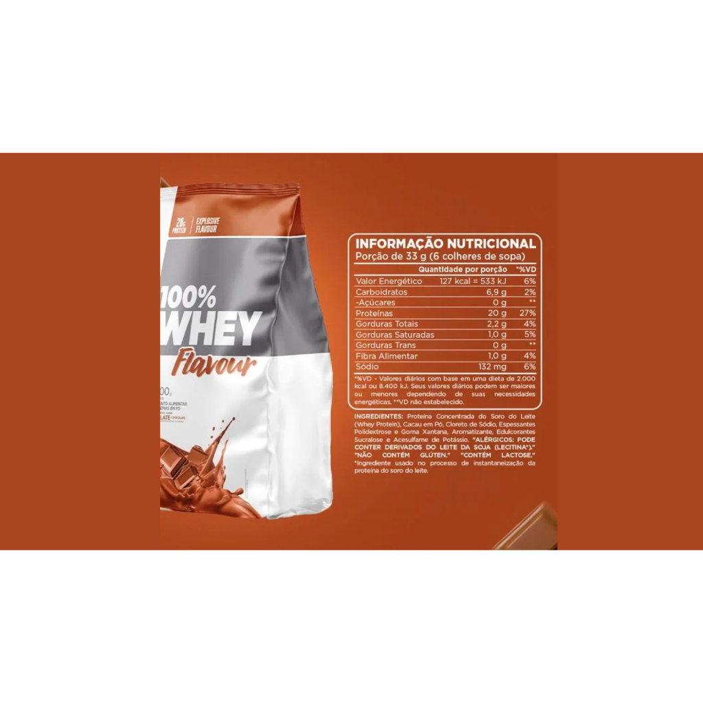 "100% Whey Flavour formulado com WPC, proteína concentrada do soro do leite, de alto valor biológico e perfil de aminoácidos. Fornece 20 g de proteínas por porção e disponível em 3 deliciosos sabores, para diversificar seu plano alimentar. Benefícios 100% Whey Flavour tem preparo ágil, é cremoso, saboroso, livre de açúcares e muito versátil. Você pode consumir de forma tradicional, misturando com água ou leite, além de poder utilizar em receitas para turbinar o sabor. No dia a dia 100% Whey Flavour pode ser consumido a qualquer hora do dia. Você pode criar preparos deliciosos como bebidas cremosas, adicioná-lo a frutas, cremes doces e iogurtes com cereais. Antes ou depois do treino Perfeito para tomar após as atividades físicas, 100% Whey Flavour também pode ser consumido no café da manhã ou no lanche da tarde. Perfeito para inovar! Experimente adicionar 100% Whey Flavour às mais variadas receitas caseiras que vão desde o preparo pronto, como bebidas e iogurtes, até bolos e tortas. Não contém: Açúcar, Glúten, Gordura Trans. Contém: 20g de proteína"