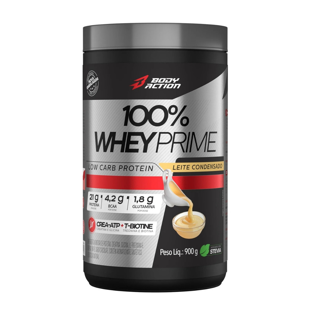 100% Whey Prime Pote 900g Bodyaction Sobre o produto O 100% Whey Prime Bodyaction é um suplemento proteico de alta qualidade, elaborado com Whey Protein Concentrado (WPC) ultrafiltrado, que proporciona rápida digestão e absorção para otimizar a recuperação muscular, o ganho de massa magra e a performance nos treinos. Sua fórmula é enriquecida com Crea-ATP® — uma combinação exclusiva de creatina com glicina — que auxilia no aumento da força, resistência e síntese de proteínas. Além disso, contém alto teor de BCAAs e glutamina, fundamentais para o processo de recuperação muscular e redução da fadiga. Com 22g de proteína por porção, o 100% Whey Prime é indicado para quem busca desempenho elevado e conveniência na rotina de suplementação. Como consumir Misture 30g (1 porção) em 200ml de água ou bebida de sua preferência. Consumir 1 vez ao dia, preferencialmente após o treino ou conforme orientação de um profissional da saúde. Benefícios • 22g de proteína por porção • Com Crea-ATP® (Creatina + Glicina) • 4,2g de BCAAs • 1,8g de Glutamina • Suporte à recuperação e ao crescimento muscular • Melhora da força e resistência física • Fácil digestão e absorção rápida • Prático para o dia a dia • Disponível em diversos sabores Alergênicos Contém derivados de leite e soja. Pode conter traços de ovo. Não contém glúten. Ingredientes Proteína do soro do leite concentrada (WPC), Crea-ATP® (creatina + glicina), L-treonina, D-biotina, cacau em pó (no sabor chocolate), aromatizantes, edulcorante glicosídeo de steviol (stevia rebaudiana). Advertências • Este produto não é um medicamento • Não exceder a recomendação diária de consumo • Não indicado para gestantes, lactantes e crianças • Manter fora do alcance de crianças Conclusão 100% Whey Prime Bodyaction é a escolha certa para atletas e praticantes de atividades físicas que buscam ganho de massa muscular, recuperação eficiente e melhor desempenho. Com fórmula avançada, excelente perfil de aminoácidos e a praticidade do consumo diário, ele entrega resultados reais com sabor e qualidade.