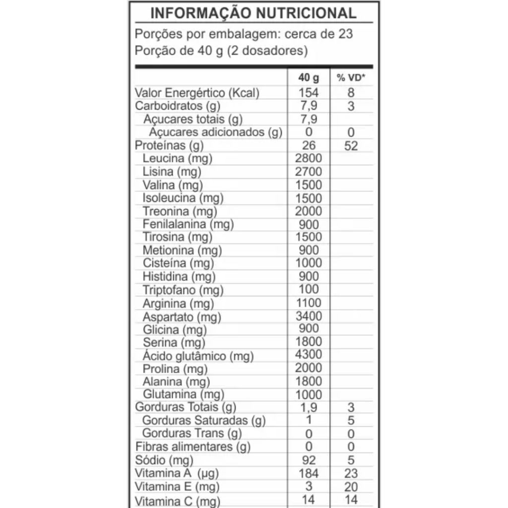 100% Whey Protein - 26g de Proteína por Porção Obtenha poder e nutrição essenciais para seu treino com nosso 100% Whey Protein. Cada porção contém 26g de proteínas e 5,8g de BCAAs, além de ser rico em vitaminas B12 e B6. ------------------ Benefícios: ------------------ Ideal para maximizar desempenho, recuperação e crescimento muscular. Textura cremosa e sabor delicioso, fácil de misturar com água ou leite. Complementa sua dieta diária para alcançar suas metas de treinamento. ---------------------------- Sugestão de Uso: ---------------------------- Diluir 2 dosadores (40g) em 250ml de água ou conforme orientação de um especialista; Pode ser consumido com água gelada ou sua bebida preferida. Recomendado para adultos acima de 19 anos ou conforme orientação profissional. --------------------- Ingredientes: --------------------- Proteína Concentrada do soro de leite, Glutamina, mix de vitaminas (acetato de retinol, mononitrato de tiamina, riboflavina, niacinamida, pantotenato de cálcio, cloridrato de piridoxina, cianocobalamina, ácido ascórbico, acetato de tocoferol, D-biotina, ácido fólico, carbonato de cálcio, sulfato de cobre, picolinato de cromo, iodeto de potássio, molibdato de sódio, selenito de sódio), aroma idêntico ao natural de baunilha, edulcorante sucralose, ciclamato de sódio, acessulfame de potássio, sacarina sódica, corante inorgânico dióxido de titânio.