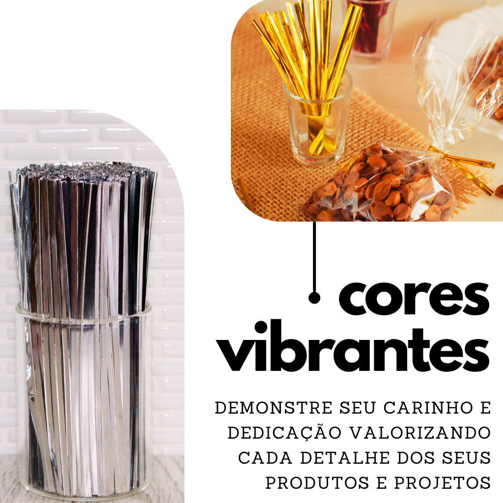 ⚜️⚜️⚜️ AMARRILHO - ARAME PLASTIFICADO ⚜️⚜️⚜️ Este produto é muito utilizado para fechar embalagens de diversos tipos. Desde fechar pacotes de alimentos em casa, ou fechar embalagens no seu comércio, acompanhando um cartãozinho de agradecimento, por exemplo. As cores chamativas e metalizadas vão dar o toque especial. Confira algumas sugestões de uso abaixo. ✔️ Informações do produto ◻️ Quantidade: 1000 amarrilhos ◻️ Cores: Dourado, prata, vermelho, verde, roxo e pink ✔️ Sugestões de uso ◻️ Fechar embalagem de alimentos ◻️ Fechar embalagens de produto, fixando o cartão de agradecimento ◻️ Artesanato ◻️ Máscaras, auxiliando no molde do nariz ◻️ Enfeites de natal e presentes ❤️Vendido por Arello Utilidades❤️
