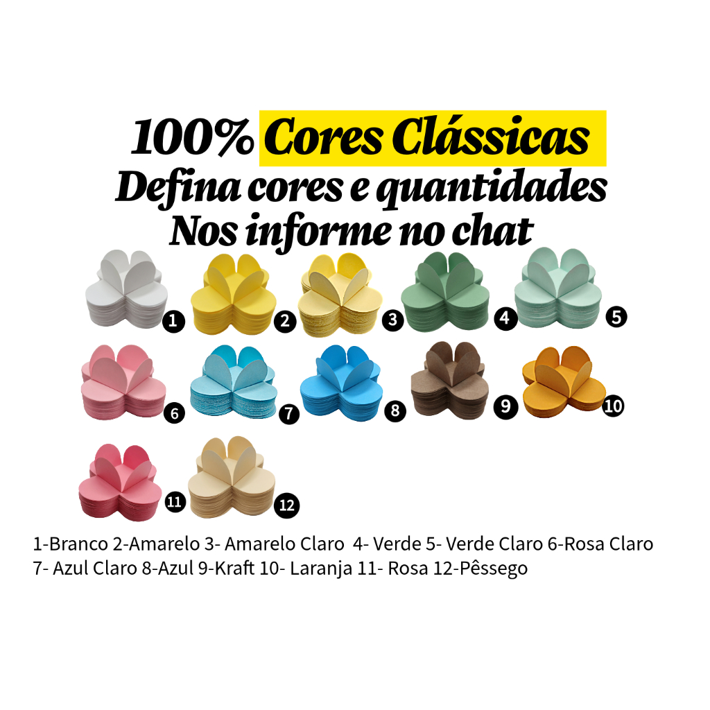 ATENÇÃO: LEIA A DESCRIÇÃO DO PRODUTO E CASO TENHA DUVÍDA ENTRE EM CONTATO. Você pode escolher as cores do seu pedido nos informando no chat conforme abaixo. Quando realizar a compra na opção de 50/100% colorido ou 50/100% Premium, você deve entrar em contato pelo chat e informar as cores que deseja. Lembrando a quantidade mínimo enviada são 100 unidades por cor. Cores Clássicas e Premium tem diferença de custos, não atenderemos solicitações de cores Premium na compra das cores clássicas por isso verifique o item que está no carrinho. Informe de imediato as cores que deseja, assim que o pedido é conferido não alteramos as cores que seram enviadas. FORMINHA NR 5 Segue a mesma regra anterior, após a compra você informe as cores que deseja e caso não informe enviaremos o item branco que é o padrão. Pacotes de 100 unidades. DEFINIÇÃO DE CORES DOS PEDIDOS MESCLADOS. Após a compra entre no chat e nos informe as cores que deseja dos itens comprados, após impressão da nota e conferência não alteramos as cores que serão enviadas. Sua mensagem de definição de cores tem que vir depois da sua compra, mesmo que você já tenha informado em uma conversa anterior. Só consideramos o que foi definido após a sua compra. CASO NÃO INFORME A COR ENVIAREMOS O PEDIDO COM CORES DISPONÍVEIS E SORTIDAS. ATENÇÂO NÂO TEMOS PACOTES DE 50 UNIDADES. Trabalhamos com papel de alta qualidade. Descrição do Produto : Forminha 04 Pétalas Branca ou colorida Tamanho: Alt. 2,5 cm / Base 3,3 cm / Base 3,3 cm Papel FCard 130/150/180 grs Forminha 04 Pétalas Neon Tamanho: Alt. 2,5 cm / Base 3,3 cm / Base 3,3 cm Papel FCard 120 grs Forminha 04 Pétalas Kraft Tamanho: Alt. 2,5 cm / Base 3,3 cm / Base 3,3 cm Papel Kraft 150 grs Quantidade mínima: 1000unidades Obs: Verifique os detalhes de sua compra (Tamanho/Cor/Tipo de Papel/Peso), caso tenha alguma duvida entre em contato, teremos o mais prazer em responder.