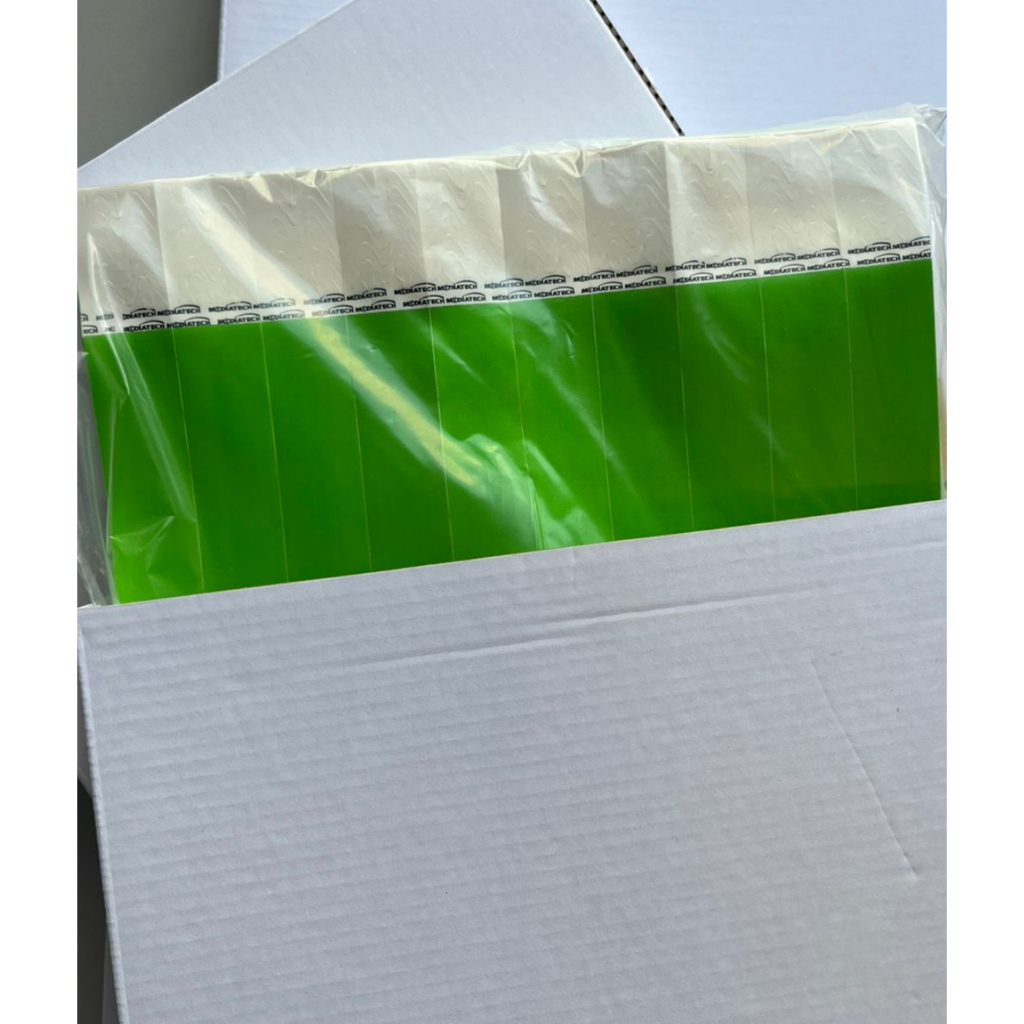 1000 Pulseira de identificação verde para triagem MED Hband Pulseiras de identificação duráveis e resistentes. Confeccionadas em material sintético de alta densidade. Pulseiras ideais para identificação e controle de acesso para qualquer situação. Use para eventos em geral, uso hospitalar para controle de acesso e triagem, parques, hotéis, festivais, festas, e etc. Pulseiras de identificação com cores vibrantes e ótima impressão. Todas as cores da escala de Manchester (classificação de risco) disponíveis. Testado uso contínuo no pulso por 15 dias (poderia ficar mais). Possui resistência á água. Não indicado para uso contínuo (piscina) o lacre é de cola e pode abrir com atrito na água. Medidas: 18,41X245MM Pacote com mil unidades Pulseira de identificação indicada para uso sem impressão. Permite personalizar com caneta esferográfica ou colocação de etiqueta. Não contém Látex, não tóxica, não irrita a pele, pirogênica. Armazenar em ambiente arejado, não deixar, em hipótese alguma, exposta sob a luz do sol ou calor excessivo.