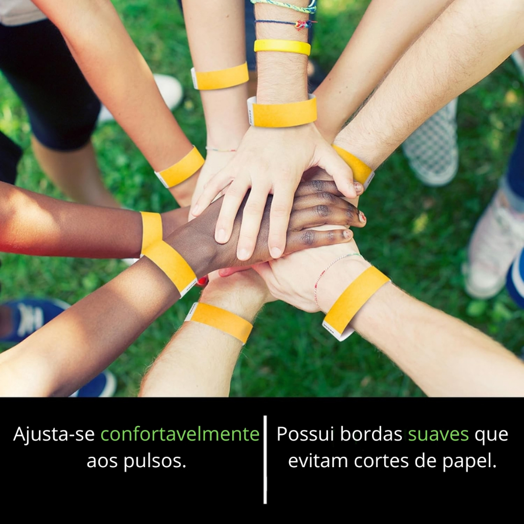 Pulseiras de Identificação Tyvek – Kit com 1000 Unidades – Cor Amarela A escolha ideal para eventos, festas e controle de acesso. Produzidas em Tyvek, um material sintético resistente à água e a rasgos, as pulseiras garantem conforto e segurança durante o uso. O fechamento com lacre adesivo inviolável impede reutilização, oferecendo um controle eficiente e confiável. São indicadas para uso único, mas quando não removidas, podem permanecer no pulso por mais de um dia, mantendo sua integridade mesmo em condições de umidade ou movimentação intensa. Características do Produto: Cor: Amarela Quantidade: 1000 unidades Tamanho: Único (ajustável ao pulso) Material: Tyvek (papel sintético resistente) Fechamento: Lacre adesivo inviolável À prova d’água Uso único (descartável) Produto sem personalização Duração: Pode permanecer no pulso por mais de um dia, se não for retirada Indicações de uso: Festas Eventos corporativos Shows e festivais Ambientes escolares e hospitalares