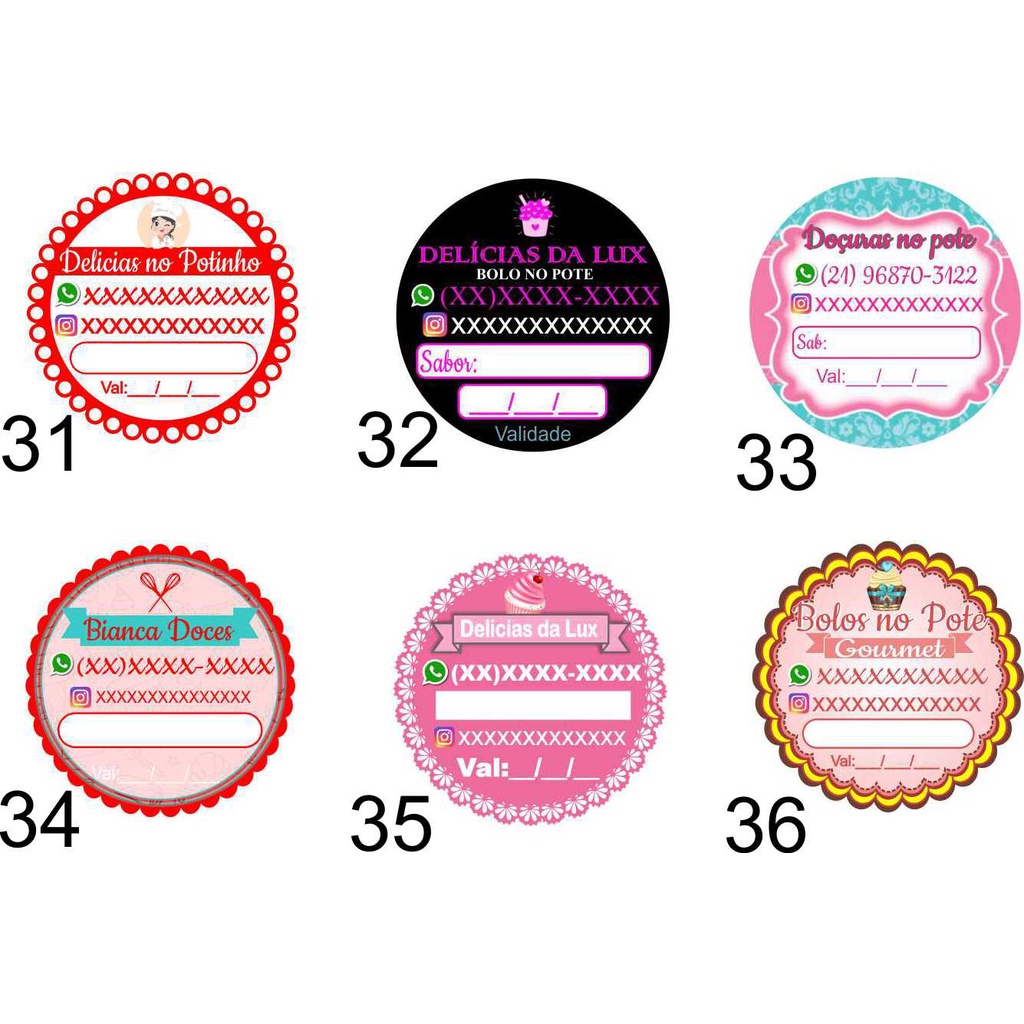 Passo a Passo de como escolher sua tag! 1 – Escolha pelos números na foto do anúncio 2 - Quais alterações deseja. Ex. Bolo no Pote Trocar para Bolo da Fran, receitas da Lux, etc. ( somente alterações de texto). 3 – Informe o Whats-App 4 – Informe o Insta-gram ****A T E N Ç Ã O **** *Se não escolher o modelo em 24hs após a aprovação da compra será enviado o modelo de numero 1 *Se não informar algum campo ele é automaticamente excluído da Tag *Se escolher alguma alteração e não escolher o modelo será editado na tag de numero 2 *Apenas 1 arte por item comprado, para escolher mais que um modelo precisa comprar mais de um item do produto. ********** OBSERVAÇÃO ********** Se enviar sua arte pronta também produzimos exatamente a partir de sua arte, adequando somente os formatos entre quadrado ou redondo. ********* ALTERAÇÕES ************* Alterações da arte do cliente como acrescentar ou retirar campos, assim como mudança de cores ou tamanho de campos pode ter custos adicionais. Não exite em nos chamar no chat para esclarecer qualquer dúvida que possa ter sobre a produção das etiquetas! - Papel Adesivo fotográfico (resistente a água) - Impressão de alta qualidade OBSERVAÇÕES IMPORTANTES: 1. Pode haver divergência de cor entre monitores e impressão. Pois cada monitor tem uma resolução, e o tipo de cores trabalhados em monitores é diferente do tipo de cores trabalhados pela impressora. Lux Personalização, inovando para te atender melhor sempre!