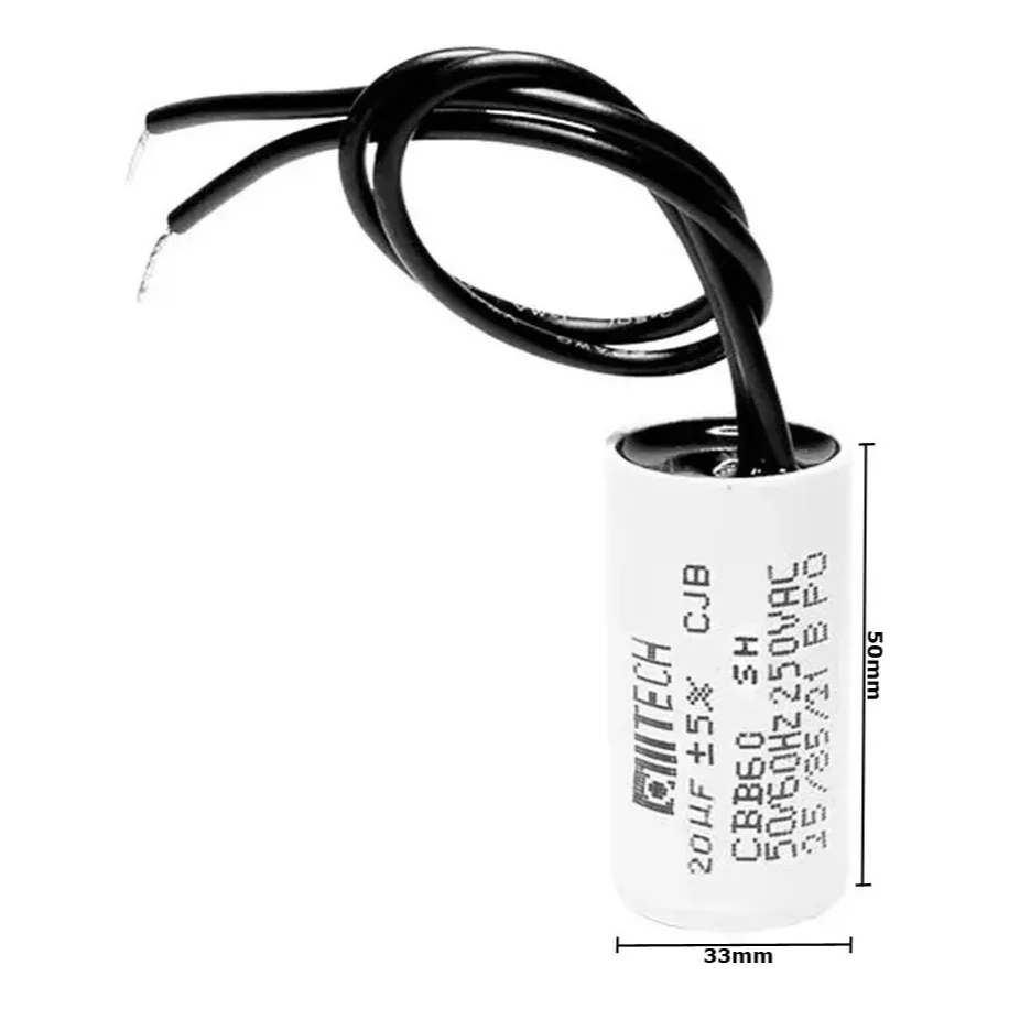 KIT 10 UNIDADES: - Capacitor 20UF 2 Fios 250V - Frequência: 50/60 HZ - Material: Poliester - Peso do produto: 65 gramas Capacitor de partida para automatizador de portão, PPA, GAREN, ROSSI, RCG, motores deslizantes, basculantes e pivotantes, entre outras funções, motores industriais, robo pivotante.