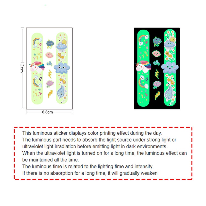 Nome do Produto Informações: Adesivo de tatuagem de desenho animado Nightlight Embalagem: um conjunto de 10 modelos diferentes em um pacote OPP Peso: um conjunto de 10 folhas, cerca de 18g Tamanho: lembrete de 6,8x12cm Este adesivo luminoso mostra efeito de impressão de cores durante o Dia. A parte luminosa precisa ser irradiada por uma luz forte ou ultravioleta primeiro a lâmpada ultravioleta só pode emitir luz em ambientes escuros absorvendo fontes de luz fortes ou ultravioleta. Quando a lâmpada ultravioleta é ligada por um longo tempo, pode manter o efeito luminoso o tempo todo. O tempo luminoso está relacionado ao tempo de iluminação e intensidade, e se não for absorvido por um longo tempo, o tempo luminoso está relacionado ao tempo de iluminação e intensidade, e se não for absorvido por um longo tempo, gradualmente enfraquecerá