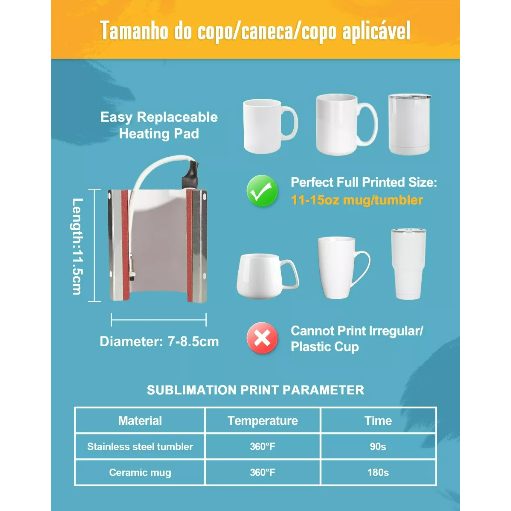 Marca:Mecolour Prensa Térmica para Sublimação em Canecas Squeezes Copos Modelo: Ele é uma atualização Prensa Térmica para personalização de Canecas Squeezes Copos Cilíndricas Voltagem:110v ou 220v (faça a escolha da voltagem na hora da compra) Potência:350w Temperatura:0-200°C Tempo para configuração:0-999s Aera para impressão:11Oz Acompanha Resistência de 11OZ(110v de cabo branco e 220v de cabo preto ) -Compacta de fácil manuseio e leve -Aviso sonoro quando a sublimação é terminada -Visor digital com timer e temperatura -Ajuste de temperatura de 0°C em 200°C -Alavanca de alta pressão Dicas para estampar: ---Antes de estampar, limpe a superfície do seu produto com uma flanela seca para retirar possíveis poeiras e resíduos; ---Deixe o papel impresso em contato com um pouco de calor da prensa para retirar possível umidade do tempo; ---Centralize bem o desenho e prenda com uma etiqueta adesiva (sugerimos aquelas etiquetas térmicas, que não deixam resíduo de cola no produto estampado); ---Não queime a estampagem ---siga adequadamente modo de tempo e temperatura.