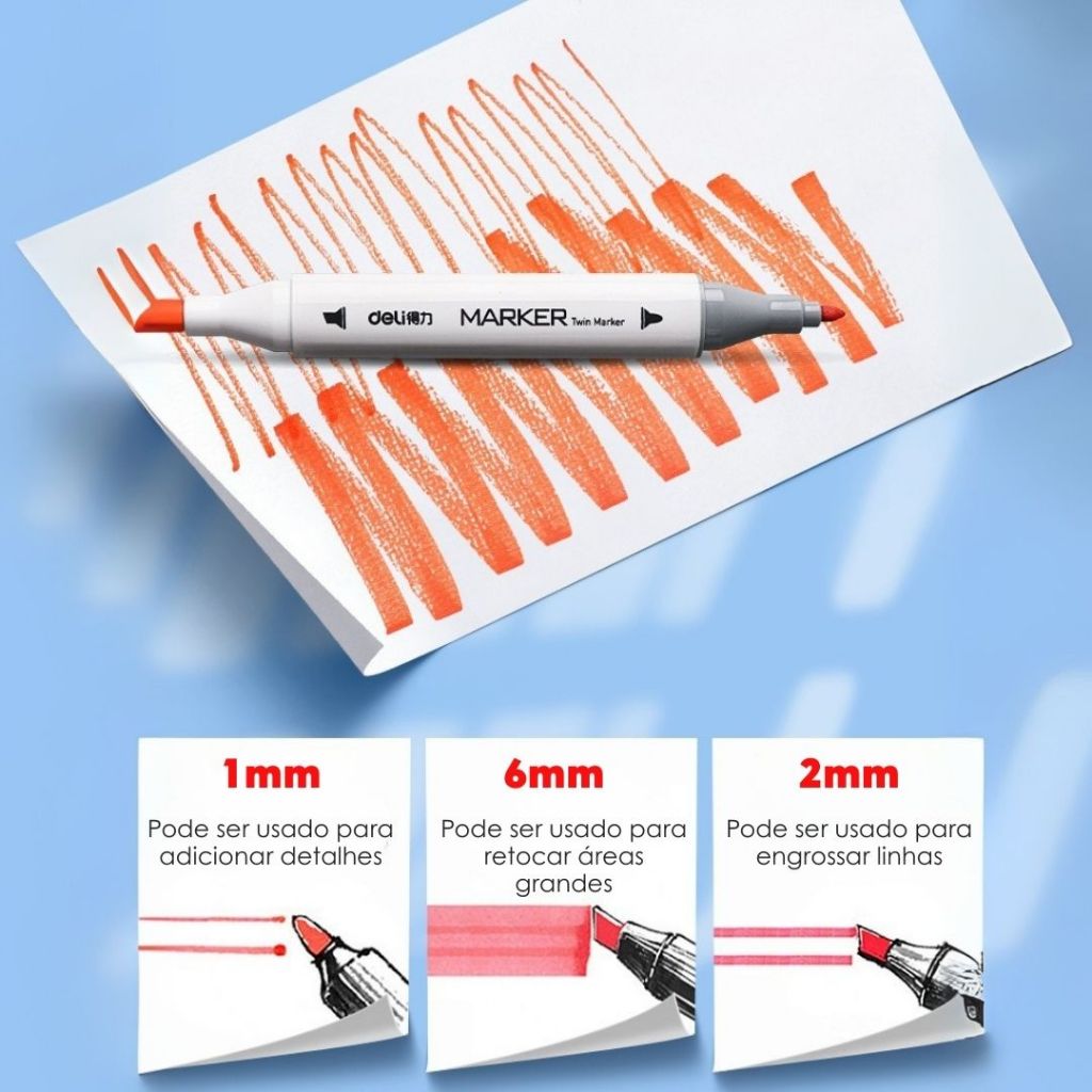 🎨 Descrição do Produto Libere sua imaginação com os marcadores de ponta dupla em cores vibrantes! Cada caneta oferece duas pontas (fina e larga), permitindo desde traços delicados até preenchimentos maiores. Com alta pigmentação, secagem rápida e embalagem prática em caixa plástica transparente, este kit é perfeito para estudos, artesanato, desenho profissional e hobby criativo. 🌟 Principais Características ✅ Pontas duplas (1mm fina + 6mm larga) – para contorno, preenchimento e sublinhado ✅ Cores vivas e pigmentadas – resultado intenso, sem desbotar ✅ Secagem rápida e sem manchas – use em cadernos e livros sem borrar ✅ Versatilidade de uso – ideal para papel, vidro, tecido, madeira, pedra e outros materiais ✅ Atóxico e sem cheiro – seguro até para crianças ✅ Organização prática – embalagem em caixa plástica transparente, fácil de transportar e guardar 📦 Opções de Quantidade Kit com 12 cores Kit com 24 cores Kit com 36 cores Kit com 48 cores Kit com 60 cores Kit com 80 cores (Todos os kits acompanham caixa plástica transparente) 📏 Especificações Técnicas Tipo: Marcadores de arte acrílica Pontas: Dupla (fina 1mm / larga 6mm) – redonda e oblíqua Comprimento aproximado da caneta: 15,2 cm Embalagem: Caixa plástica transparente 📦 Conteúdo da Embalagem 1x Kit de marcadores (quantidade de cores conforme variação escolhida) ⚠️ Observações Manter as canetas bem tampadas após o uso para evitar ressecamento. Produto atóxico e seguro, porém recomendado uso infantil sob supervisão.