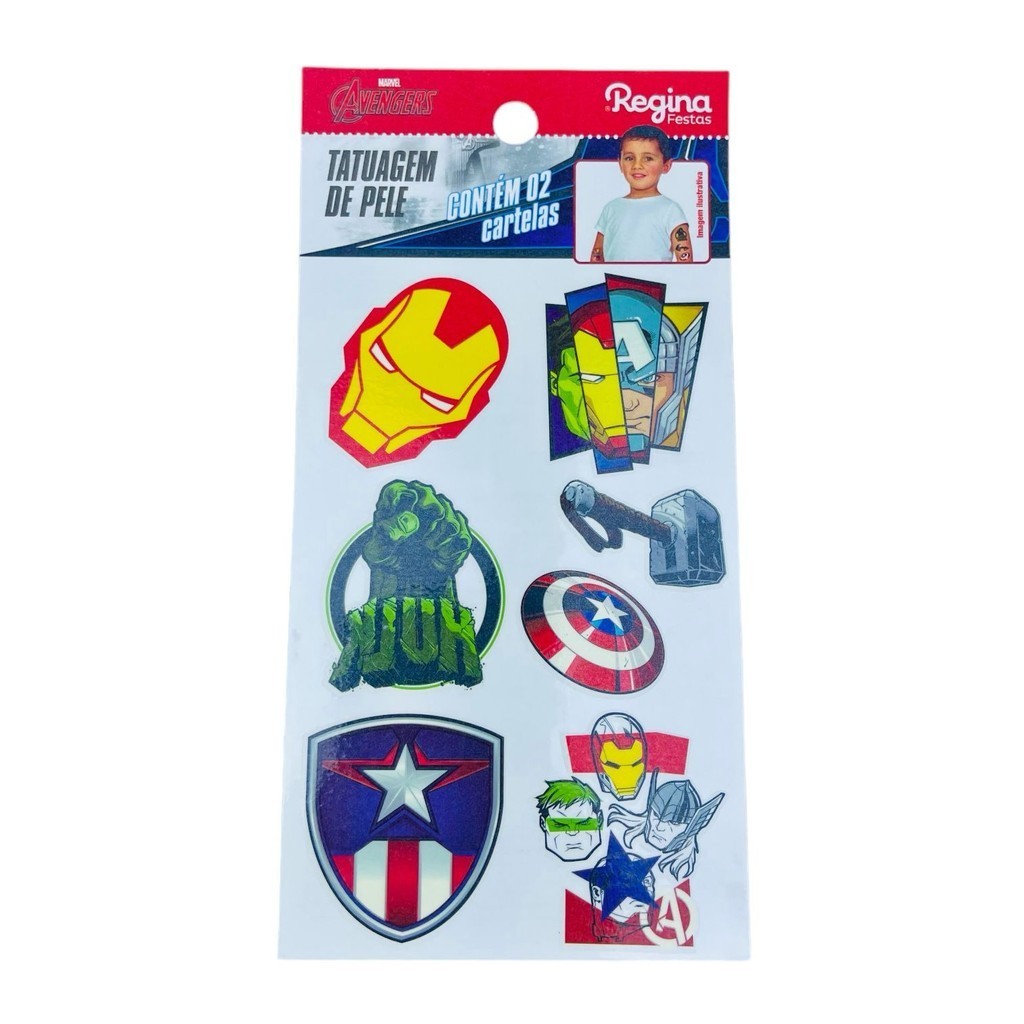 12 TATUAGENS INFANTIS DE PELE MARVEL AVENGERSANIMATED (REGINA) - CONTÉM 2 CARTELAS COM 6 TATUAGENS REMOVÍVEIS CADA. - NÃO TÓXICO. - TESTADO PELO INMETRO. MODO DE USO: VIDE A EMBALAGEM MEDIDA DA CARTELA: 10 cm largura e 20 cm altura ATENÇÃO: - NÃO RECOMENDÁVEL PARA MENORES DE 3 ANOS POR CONTER PARTES PEQUENAS QUE PODEM SER ENGOLIDAS OU ASPIRADAS. - MANTENHA O SACO PLÁSTICO LONGE DO ALCANCE DE CRIANÇAS PARA EVITAR ASFIXIA.