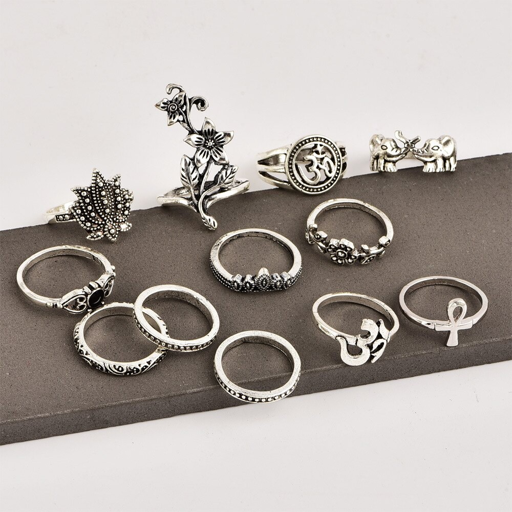 12 Anéis Detalhes Coroa Lótus Flores Elefantes