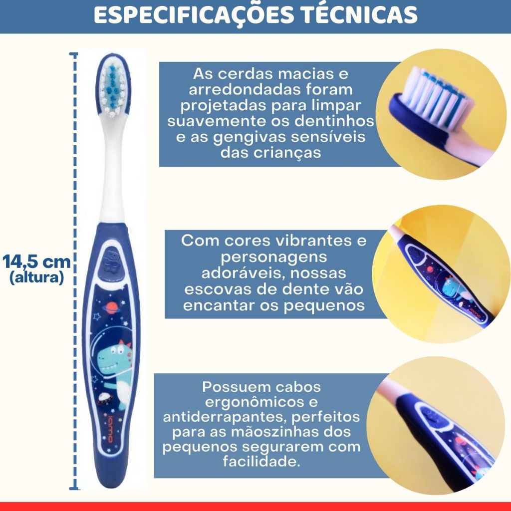 Cuide do sorriso dos seus filhos de forma divertida e eficaz com a nossa escova de dente infantil. Desenvolvida especialmente para as crianças acima de 3 anos, ela torna a escovação uma experiência alegre e educativa. Com cores vibrantes e personagens adoráveis, nossas escovas de dente vão encantar os pequenos, incentivando-os a adotar bons hábitos desde cedo. As cerdas macias e arredondadas foram projetadas para limpar suavemente os dentinhos e as gengivas sensíveis das crianças, proporcionando uma escovação segura e confortável. Tamanho: 14,5cm Kit contem 12 escovas de cores sortidas Faça da escovação uma atividade em família! Acompanhe seus filhos, mostre a importância de cuidar dos dentes e chorar uma rotina divertida e saudável para toda a família. Cuide do sorriso dos seus filhos com carinho e qualidade!