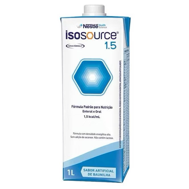 Isosource 1.5 1000ml Nestle O Isosource 1.5 é um alimento enteral nutricionalmente completo. Possui alta concentração calórica e é normoproteico, com 8 g/L de fibra. O consumo desse alimento pode ser realizado via oral ou por sonda. alérgicos: contém derivados de leite E soja. não contém glúten. Isosource 1.5: para que serve? O Isosource 1.5 é utilizado na alimentação de pacientes que sofreram uma perda exacerbada de peso e massa magra. Pois, por ser um alimento hipercalórico e normoprotéico, o Isosource 1.5 fornece energia e proteína ao paciente, contribuindo para a recuperação do quadro nutricional. Além disso, por conter fibras, o Isosource 1.5 contribui para a regularização do fluxo intestinal de quem é alimentado com essa dieta. Para quem o Isosource 1.5 é indicado? O Isosource 1.5 é indicado para a recuperação do quadro nutricional de pacientes com elevadas necessidades calóricas ocasionadas pela perda exacerbada de peso e massa magra. Essa dieta também é recomendada para pacientes que precisam de uma dieta hipercalórica mas que não suportam ingerir um grande volume de líquidos. Benefícios do Isosource 1.5 O Isosource 1.5 ajuda a satisfazer as necessidades nutricionais de pacientes que precisam de uma dieta composta por níveis elevados de calorias. Por ser hipercalórico, o Isosource 1.5 pode ser uma boa alternativa para promover a nutrição de pacientes que toleram a ingestão de apenas um pequeno volume de líquido Isosource 1.5: como usar? O consumo de Isosource 1.5 e deve ser realizado de acordo com as orientações de um médico ou nutricionista. Atenção: Isosource 1.5 não deve ser aquecido. Aquecê-lo pode resultar na alteração dos componentes da fórmula, ocasionando perda nutricional. Além disso, o aquecimento da fórmula pode provocar intolerâncias ao paciente. alimentação via sonda A dieta deve ser administrada em temperatura ambiente. Caso esteja sob refrigeração, será necessário separar o volume que deverá ser administrado em um frasco descartável para dieta. Esse frasco contendo a dieta enteral gelada deverá ser mantido fora da geladeira por cerca de 30 minutos, até que atinja a temperatura ambiente. alimentação via oral Agite a embalagem da dieta enteral e oral e em seguida abra e despeje o seu conteúdo no recipiente até atingir o volume prescrito pelo médico ou nutricionista. Como conservar o Isosource 1.5? A dieta enteral deve ser armazenada em temperatura ambiente e em local fresco e seco. Além disso, não deve ser exposta ao calor. Após a abertura da embalagem, a dieta deverá ser consumida em um período máximo de 24 horas, mediante refrigeração. Caso não seja possível utilizar todo o conteúdo da caixa, o conteúdo restante deve ser desprezado. Para quem o Isosource 1.5 não é indicado? O Isosource 1.5 é contraindicado para alérgicos à proteína do leite e/ou à soja por conter ingredientes derivados de ambos em sua fórmula. Características Técnicas: Distribuição energética: Densidade calórica 1,5Kcal/ml 1500Kcal por litro Proteínas: 17% Carboidratos: 56% Gorduras: 27% Osmolaridade 450 mOsm/L de água. Fonte de proteínas: 84% caseinato de cálcio e sódio obtido do leite de vaca e 16% proteína de soja Fonte de carboidratos: 100% maltodextrina. Fonte de lipídeos: 54% óleo de canola, 23% óleo de soja e 23% tcm Fonte de fibras: 8 g/L, 55% fibra de soja, 20% goma acácia, 18% fos (frutooligossacarídeo) e 7% inulina