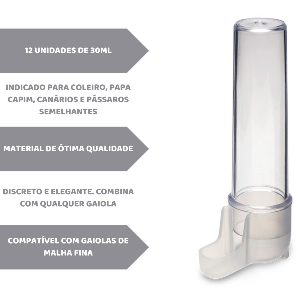 12UN Bebedouro Pássaros Pequeno Cristal 30ml + 10 Porta Vitaminas Rubi Pequeno Madeira Escura 14ml