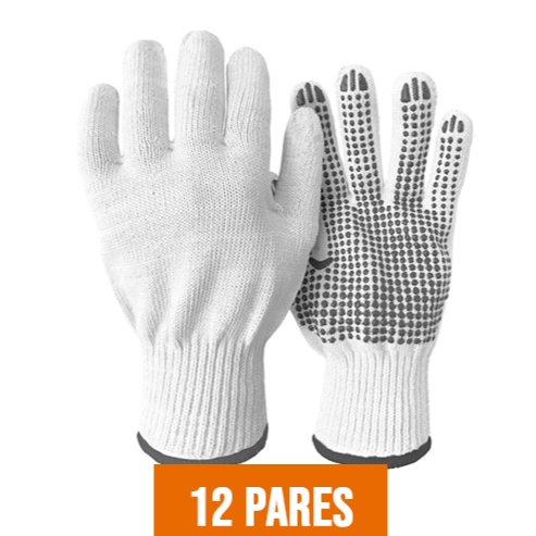 Tricotada com fios de algodão e poliéster, punho com elástico, com pigmento na face palmar e dedos, ou sem. Proteção das mãos do usuário contra agentes mecânicos, principalmente em atividades que necessitam de bom tato, como por exemplo no manuseio de materiais nas áreas de transportes, indústrias metal, mecânica, automotivas, construção civil, metalúrgicas, estamparias, etc. Marca: Plastcor C.A :31.911 Cor do pigmento: Preto Cor da luva: Branco Embalagem : 12 Pares de luvas