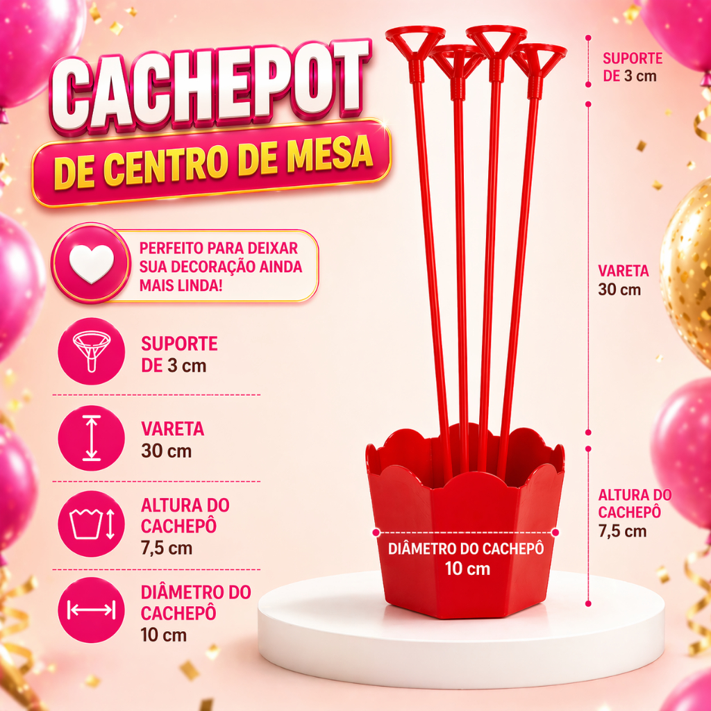 kit com 13 unidades de cachepot centro de mesa.cada cachepot acomponha 4 varetas + 4 suportes. As varetas podem ser cortadas para ajustar a altura dos balões.Medidas da hastes + suporte = 33 cm Não acompanha balões cachepot Altura do cachepô 7,5 cm Largura do cachepô 10 cm Material: Plástico Vareta Suporta balões de 5 a 9 polegadas tamanho balão comum. O kit é fornecido desmontado.Centro de mesa Ideal para lembrancinha de festa, podendo ser usado como porta doces, porta pipoca, arranjo de flores.