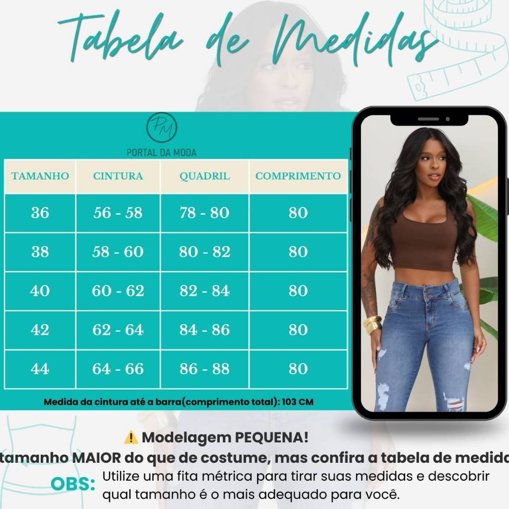 Recomendações de Tamanho Modelagem pequena – Indicamos escolher um número acima do que você costuma usar. Antes de finalizar a compra, dá uma olhadinha na tabela de medidas que está na foto do anúncio, assim você garante que vai escolher o tamanho certinho pra você! Tamanho 36 → veste como 34 Tamanho 38 → veste como 36 Tamanho 40 → veste como 38 Tamanho 42 → veste como 40 Tamanho 44 → veste como 42 Para garantir um caimento ideal, recomendamos que compare as medidas informadas com alguma peça semelhante que você já tenha em casa. CARACTERÍSTICAS Modelo: Calça Jeans Feminina Cintura Média Jeans Vestibilidade: Modela o corpo e empina o bumbum Bolsos: Dianteiros e traseiros funcionais Instruções de Lavagem: Lavar à máquina com cores semelhantes Composição: 96,5% Algodão - 3,5% Elastano ✨ Calça com Pala Coração e Dois Botões ✨ A peça que une charme e modelagem perfeita! Com pala em formato de coração e fechamento com dois botões, essa calça valoriza a cintura e cria um caimento impecável. Versátil e estilosa, é ideal para looks modernos e femininos em qualquer ocasião. Observações: Ficou com dúvidas? Chama a gente! Teremos prazer em te ajudar a escolher o tamanho ideal ❤️ PARA REFERÊNCIA: A modelo da foto veste tamanho 38. ATENÇÃO: A cor do tecido pode variar de acordo com a configuração da tela utilizada para visualização.