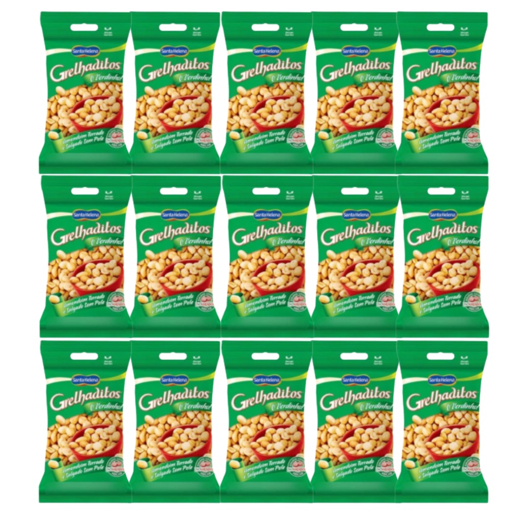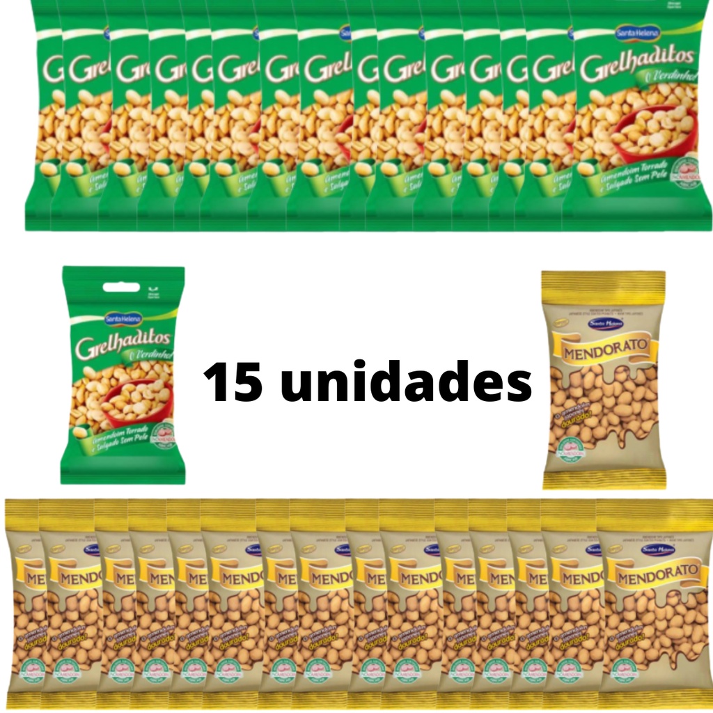 15 Pacotes de Amendoim Japonês Mendorato /Grelhaditos ou Crokíssimo Santa Helena (Com casca ou sem casca) salgados Entrega para todo o Brasil Imediata Opções e informações nutricionais: *Mendorato - 27g Apito o árbitro, é hora de abrir mais um Mendorato. Seja para acompanhar o jogo do seu time de coração ou para celebrar bons momentos com uma cerveja gelada, o Mendorato é a sua melhor escolha. O irresistível amendoim japonês, com uma casquinha douradinha e crocante, é um golaço de sabor e se tornou uma paixão nacional. Disponível em diferentes gramaturas, o Mendorato foi feito para ser o seu verdadeiro parceiro do futebol. INGREDIENTES: amendoim, farinha de trigo fortificada com ferro e ácido fólico, açúcar, sal refinado, molho de soja, amido de milho e realçador de sabor glutamato monossódico. ALÉRGICOS: CONTÉM AMENDOIM, TRIGO E DERIVADOS E SOJA E DERIVADOS. PODE CONTER OVO, LEITE, AMÊNDOAS, CASTANHA-DE-CAJU E CASTANHA-DO-BRASIL. CONTÉM GLÚTEN. INFORMAÇÃO NUTRICIONAL: Porção 30 g (1/2 xícara de chá); Valor energético 145 kcal = 605 kJ (7% VD*); Carboidratos 13 g (4% VD*); Proteínas 5,1 g (7% VD*); Gorduras totais 8,9 g (16% VD*); Gorduras saturadas 1,2 g (6% VD*); Gorduras trans 0 g (VD não estabelecido); Fibra alimentar 1,7 g (7% VD*); Sódio 288 mg (12% VD*). *% Valores Diários com base em uma dieta de 2000 kcal ou 8400 kJ. Seus valores diários podem ser maiores ou menores dependendo de suas necessidades energéticas. *Grelhaditos Amindus - 24g Amíndus é um amendoim sem pele, torrado, 100% natural e produzido com grãos selecionados criteriosamente. Nas opções Bacon, Cebola, Pimenta com Limão, Mostarda e Mel e Sem Sal, Amíndus ressalta grandiosas experiências através do paladar. Uma das novidades é que o verdinho mais querido e amado do Brasil não resistiu e entrou para essa deliciosa família: Grelhaditos agora é Amíndus. Amíndus é perfeito para harmonizar com as melhores cervejas, com os mais rebuscados drinks e para celebrar momentos promissores. Já Grelhaditos é ideal para encontros casuais e vai bem a qualquer hora do dia. Peça o seu e prove essa experiência. IINGREDIENTES: amendoim despeliculado, gordura vegetal e sal. ALÉRGICOS: CONTÉM AMENDOIM. PODE CONTER TRIGO, OVO, SOJA, LEITE, AMÊNDOAS, CASTANHA-DE-CAJU E CASTANHA-DO-BRASIL. CONTÉM GLÚTEN. INFORMAÇÃO NUTRICIONAL: Porção 15 g (1 colher de sopa); Valor energético 87 kcal = 365 kJ (4% VD*); Carboidratos 3,1 g (1% VD*); Proteínas 3,5 g (5% VD*); Gorduras totais 7,5 g (14% VD*); Gorduras saturadas 1,1 g (5% VD*); Gorduras trans 0 g (VD não estabelecido); Fibra alimentar 1,2 g (5% VD*); Sódio 77 mg (3% VD*). *% Valores Diários com base em uma dieta de 2000 kcal ou 8400 kJ. Seus valores diários podem ser maiores ou menores dependendo de suas necessidades energéticas. *Crokíssimo - 24g Crokíssimo é um amendoim com muito sabor e crocância, disponível em diversas opções de sabores, como: Levemente Salgado, Salsa e Cebola, Pimenta Suave, Churrasco, Pimenta Mexicana e ainda nas versões Boteco, que incluem os sabores: Pão de Alho, Frango à Passarinho e Picanha ao Alho. E, claro, não podemos esquecer os Ovinhos, amendoins com cobertura de polvilho. Não tem como não se deliciar com o sabor e a crocância de Crokíssimo Para quem está ligado no universo geek, gosta de games e acompanha o mundo online sem tempo a perder, não pode deixar de experimentar o melhor amendoim crocante e acompanhar a marca Crokíssimo nas redes sociais. INGREDIENTES: amendoim, amido de milho modificado, açúcar, farinha de trigo fortificada com ferro e ácido fólico, amido de milho, sal, gordura vegetal, corante natural de urucum, bicarbonato de sódio e realçador de sabor glutamato monossódico. ALÉRGICOS: CONTÉM AMENDOIM, DERIVADOS DE TRIGO E DERIVADOS DE SOJA. PODE CONTER OVO, LEITE, AMÊNDOAS, CASTANHA-DE-CAJU E CASTANHA-DO-BRASIL. CONTÉM GLÚTEN. Produto isento de registro sanitário conforme resolução RDC nº 27/2010 ANVISA. INFORMAÇÃO NUTRICIONAL: Porção 24g (1/2 de xícara de chá); Valor energético 122 kcal = 512 kJ (6% VD*); Carboidratos 8,8 g (3% VD*); Proteínas 4,5 g (6% VD*); Gorduras totais 7,6 g (14% VD*);Gorduras saturadas 1,1 g (5% VD*); Gorduras trans 0 g (**% VD*); Fibra alimentar 1,6 g (7% VD*); Sódio 161 mg (7% VD*).