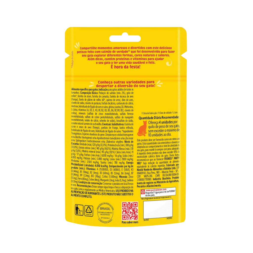 PURINA FRISKIES® PARTY MIX®: Compartilhe momentos amorosos e divertidos com este delicioso petisco feito com salmão de verdade¹ que foi desenvolvido para fazer seu gato explorar diferentes formas, cores naturais e sabores. Além disso, contém proteínas e vitaminas para ajudar o seu gato a ter uma vida saudável e feliz. Conheça outras variedades para despertar a diversão do seu gato! É hora da festa! ¹Pedaços de Salmão