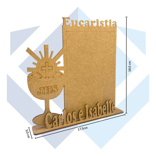 KIT DE PORTA RETRATO PRIMEIRA EUCARISTIA (COMUNHÃO) - FOTO 15X10 !!! ATENÇÃO!! O NOME TEM QUE SER IGUAL PARA TODOS, NÃO FAZEMOS COM NOMES DIFERENTS PARA CADA UM. Esse lindo porta retrato personalizado em MDF para a PRIMEIRA EUCARISTIA de seu filho(a) que já está sendo um sucesso e vem conquistando a todos é com certeza uma excelente opção para presentear familiares e amigos. Ele é perfeito como brindes comemorativos, lembrancinhas de primeira comunhão, eucaristia, ou até mesmo como presentes em outras datas comemorativas. Nosso porta retrato conta com um corte a laser preciso e de ótimo acabamento, seu design é moderno, anatômico e também leve e muito resistente. Decore o ambiente de sua casa com momentos inesquecíveis junto das pessoas mais que especiais. Desenvolvemos produtos personalizados ou não, conheça outros produtos em nossa loja. ------------------------------------ PRINCIPAIS VANTAGENS: - Prático, leve e resistente; - Montagem simples e de encaixe; (usar cola branca de boa qualidade, não acompanha) - Excelente qualidade e acabamento; - Melhor custo benefício do mercado; - Design moderno e inovador; - Para foto 10x15, tamanho padrão; (necessita colar a foto) - Estrutura em MDF cru de 2,8mm, garantindo durabilidade para o produto; - A descritivo da homenagem pode ser alterada, consulte; - Temos outros modelos disponíveis, consulte. ------------------------------------ MEDIDAS TOTAL DO PRODUTO MONTADO: - Altura: 18,0 cm - Comprimento: 17,5 cm - Largura: 3,0 cm - Encaixe para a foto: 10x15 ------------------------------------ OBSERVAÇÕES: - A tonalidade da cor do produto pode variar de acordo com a resolução da tela; - O produto é enviado desmontado para evitar danos no transporte; - Os objetos que ambientam as fotos não acompanham o produto; - Cuidados especiais: Não deixar em contato direto com a água, limpar somente com um pano levemente umedecido. ------------------------------------ GARANTIAS: - Garantia de 7 dias contra DEFEITO DE FABRICAÇÃO, executar a conferência no ato do recebimento. - Seu produto é extremamente bem embalado para que não ocorra nenhum contratempo durante o processo de entrega e assim o receba perfeitamente como saiu de fábrica!! - Se seu produto chegar danificado garantimos a troca sem custo algum aos nossos clientes! ------------------------------------ Na EBM DECORAÇÕES temos a missão de garantir a satisfação total de nossos clientes, tanto nos produtos quanto no atendimento humanizado. Atendemos todo o Brasil oferecendo experiências inesquecíveis de compras com agilidade e excelência. Todas as fotos são de produtos reais e de exclusividade da EBM DECORAÇÕES, sendo assim o uso não autorizado das imagens poderá acarretar em punições de acordo com a lei de direitos autorais. Qualquer dúvida estamos à disposição. BOAS COMPRAS!! Garantia do vendedor: 3 meses