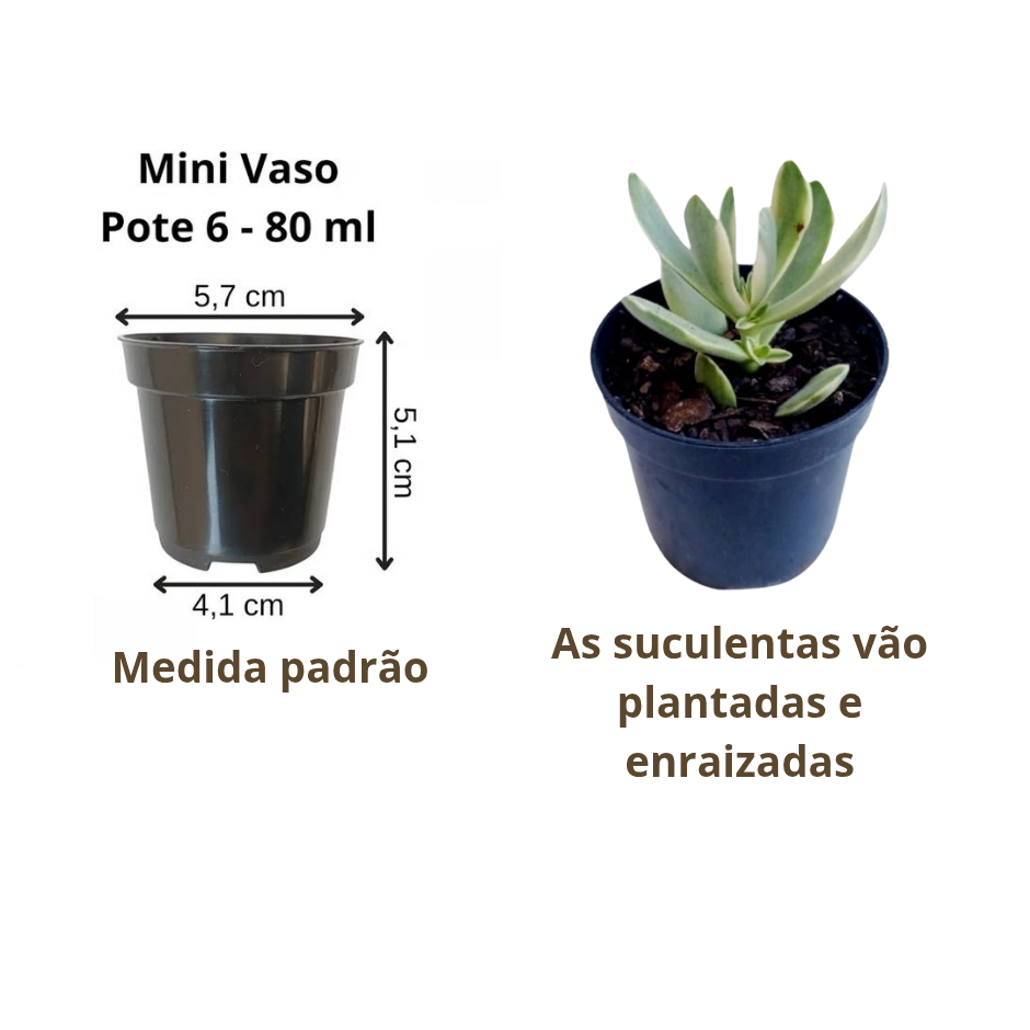Kit com suculentas naturais variadas, ideais para montagem de lembrancinhas de casamentos, aniversários, eventos corporativos e decoração de jardim. 🌵 Detalhes Técnicos do Produto Tipo de Planta: Suculentas naturais e vivas (não são artificiais). Variedade: Mix variado de espécies (Echeveria, Sedum, Crassula, entre outras). Estado das Plantas: Já enraizadas, saudáveis e prontas para o replantio ou decoração. Tamanho Médio: Variam entre 3 cm a 6 cm de diâmetro (tamanho padrão para potes 06). Opções de Kit: Disponíveis em conjuntos de 15 unidades. 📦 Conteúdo da Embalagem Plantas selecionadas com cuidado. Embalagem segura com aviso de frágil. Enviadas embaladas em papel macio individualmente em seus próprios vasos. 💡 Dicas de Cuidado Pós-Compra Luz: Necessitam de pelo menos 4 horas diárias de sol ou luz natural intensa. Rega: Regar apenas quando a terra estiver completamente seca ao toque. Evite molhar as folhas. Solo: Utilize substrato leve e bem drenado, específico para cactos e suculentas. Aviso Importante: Por serem seres vivos, a coloração e o formato podem ter pequenas variações em relação às fotos. Garantimos a seleção das plantas mais bonitas disponíveis no momento do envio! Título: Atenção ao Prazo de Entrega! 🚚🌵 Verifique se o envio para sua casa ultrapassa 10 dias. Suculentas são seres vivos e não sobrevivem muito tempo em caixas fechadas. Ajude-nos a garantir que elas cheguem lindas até você!”